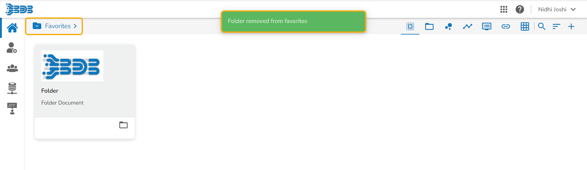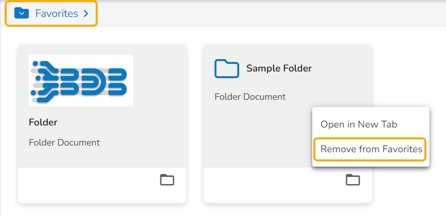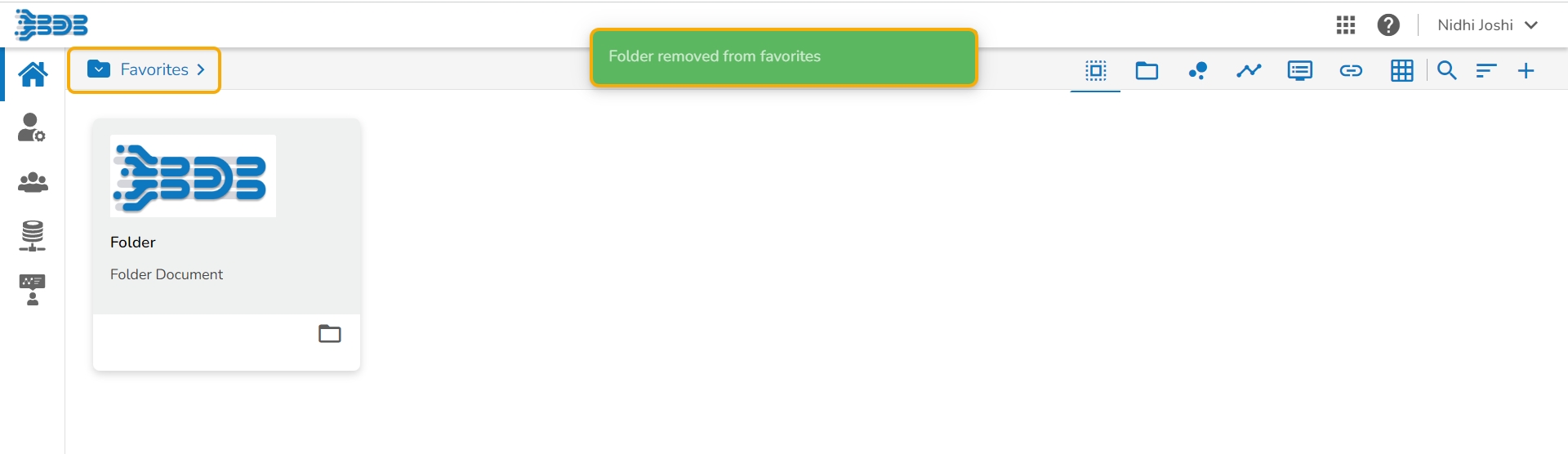 A message, “Folder removed from Favorites” appears on the screen, and the selected folder gets removed from the Favorites document space.