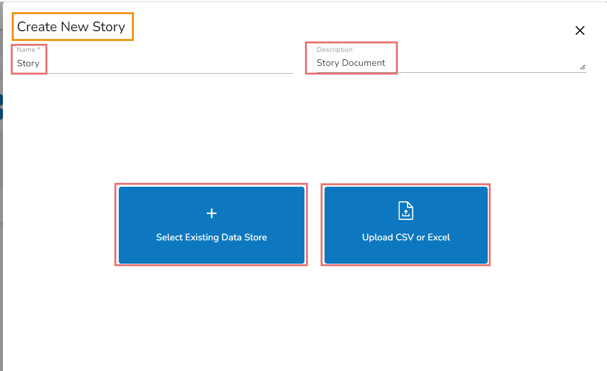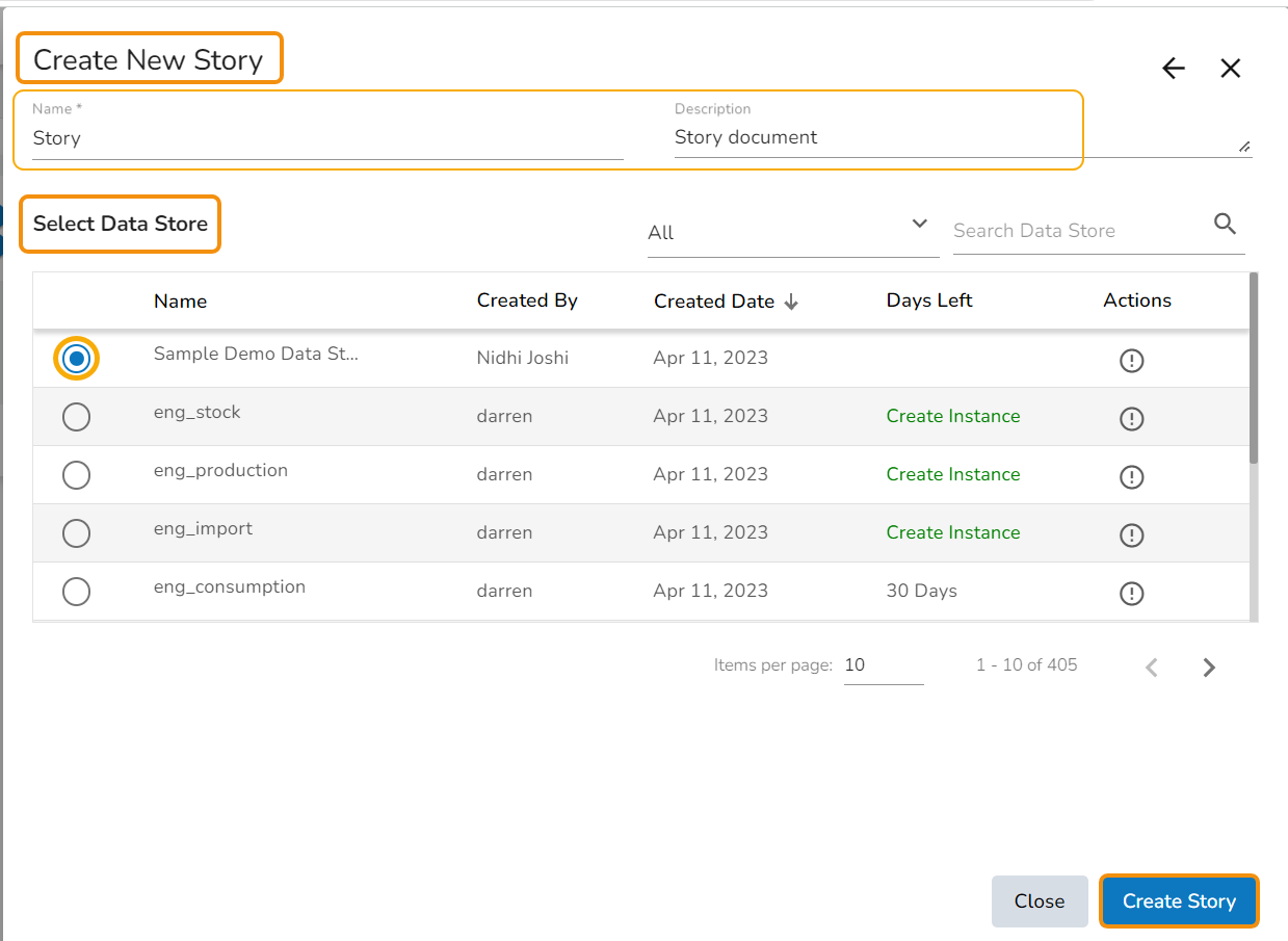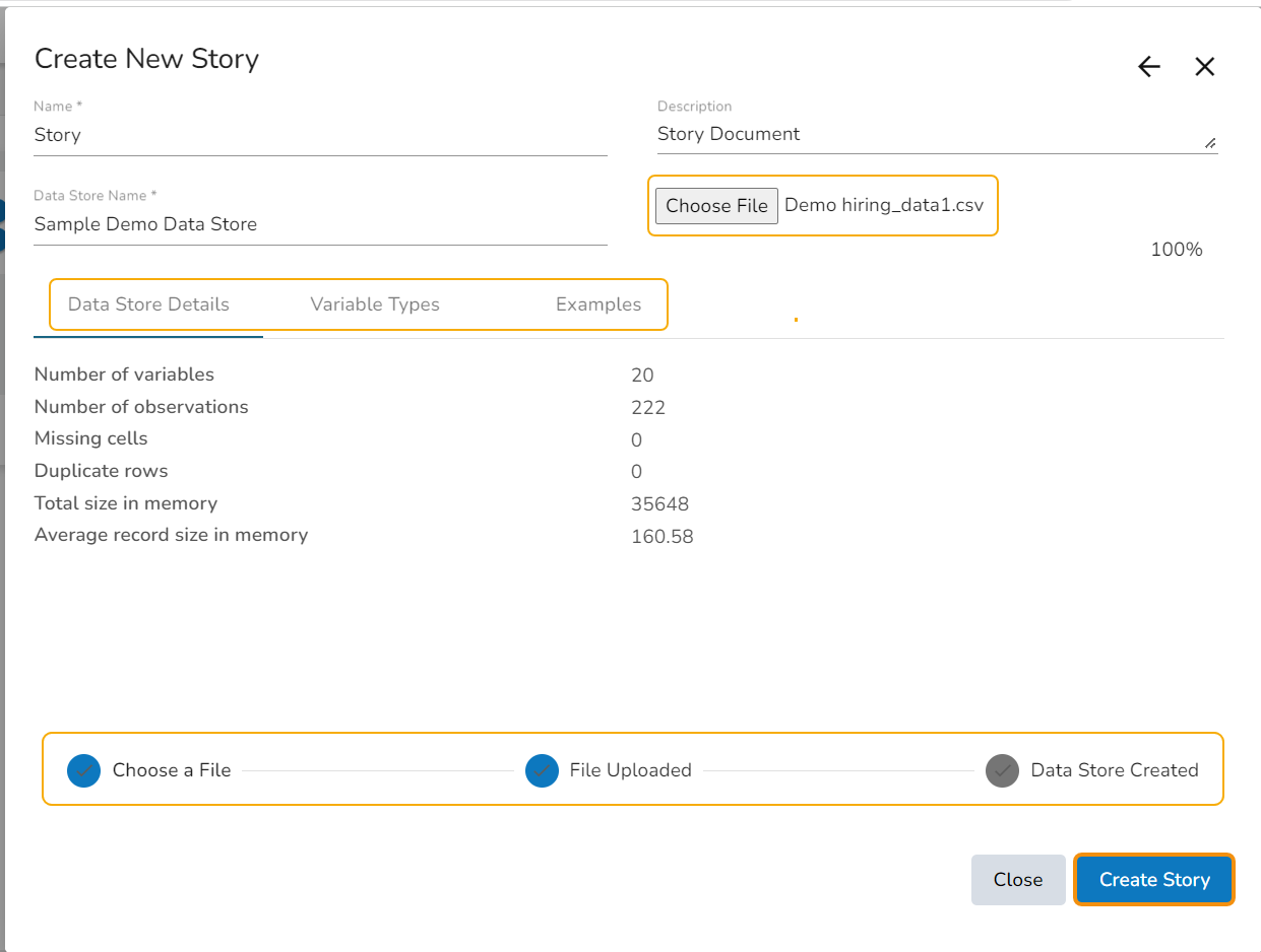 Please Note: After the user clicks the Create Story option, the Data Store also gets created and the Data Store Created option given gets a checkmark and it turns blue in color.