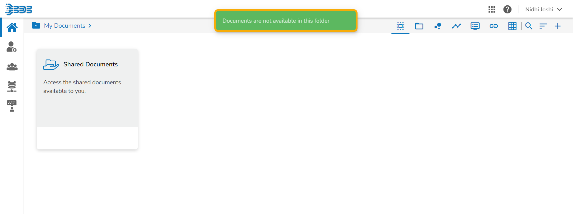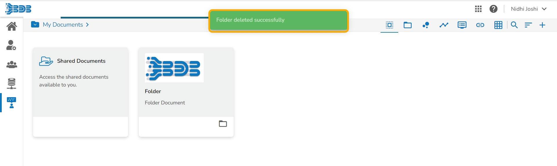 The following confirmation message appears if the deleted folder is the only document available under the My Documents space.