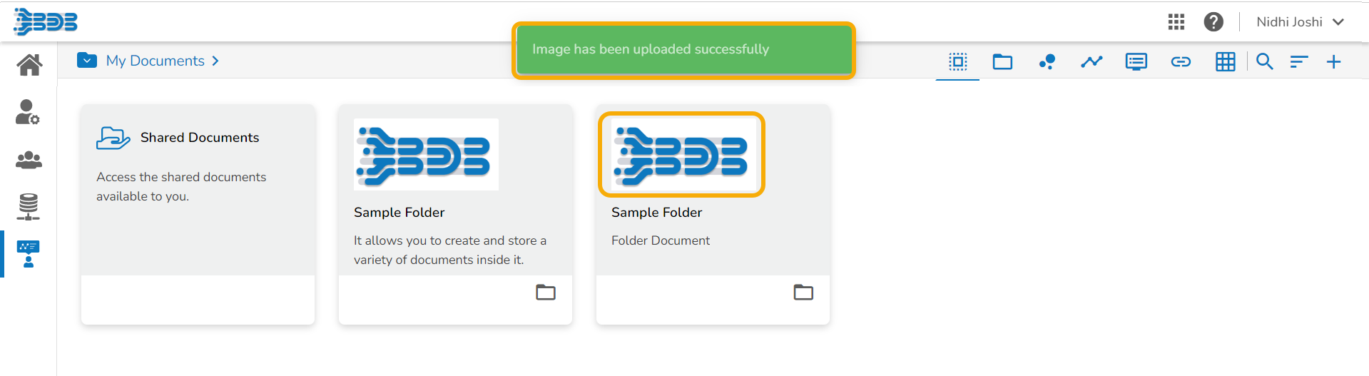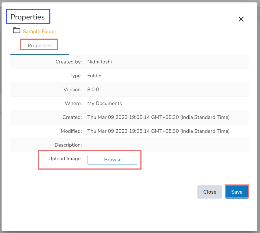 The folder Properties open displaying the name of the creator, document type, version, space, date of creation and date of modification. The inserted description also gets displayed over here. The user can also upload an image using the Properties tab.