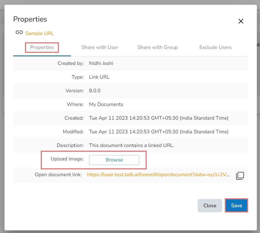 Properties: Properties tab of the linked URL document gets displayed IT displays the Version, Creator's name, space, date of creation and date of modification. The description entered by the user also gets displayed.