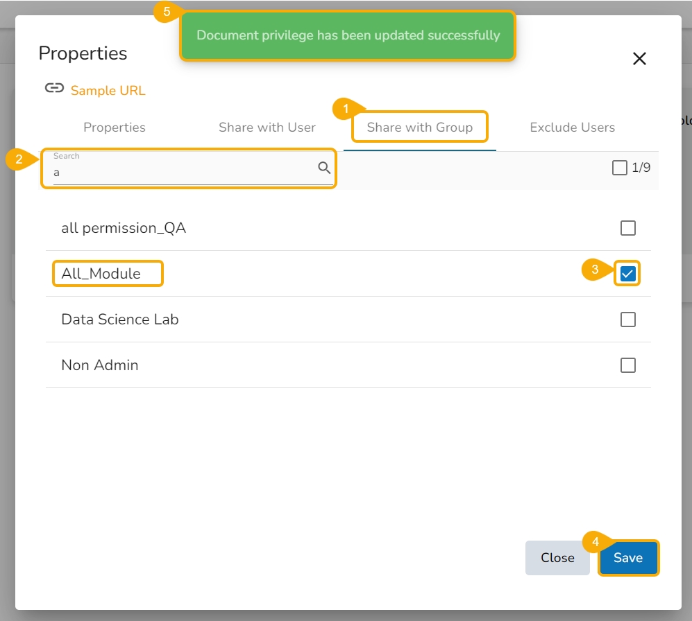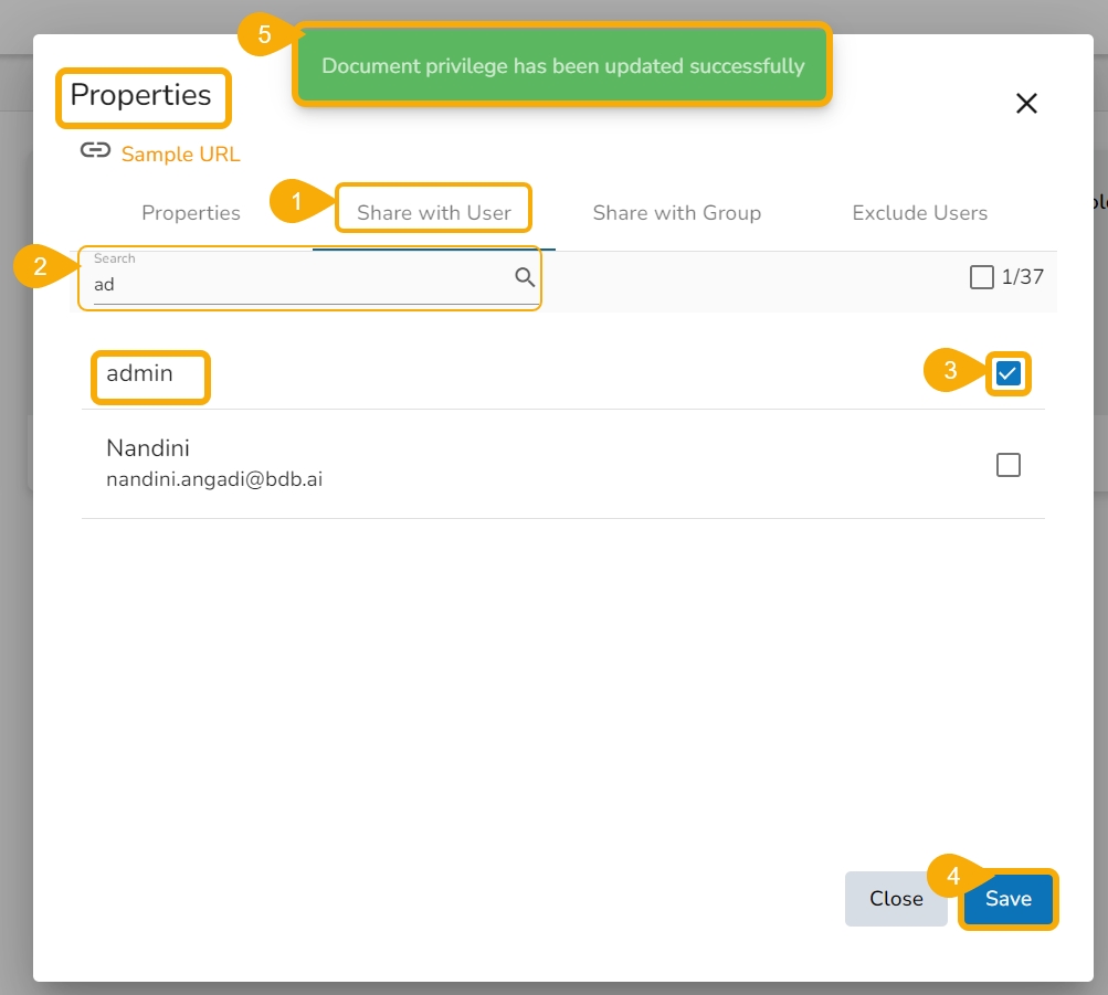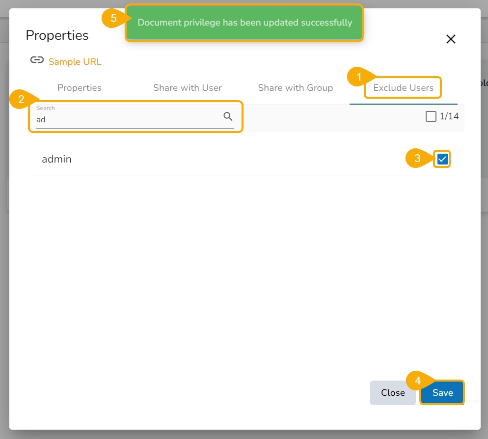 A success message appears, and the document privilege gets updated to exclude the selected user(s).