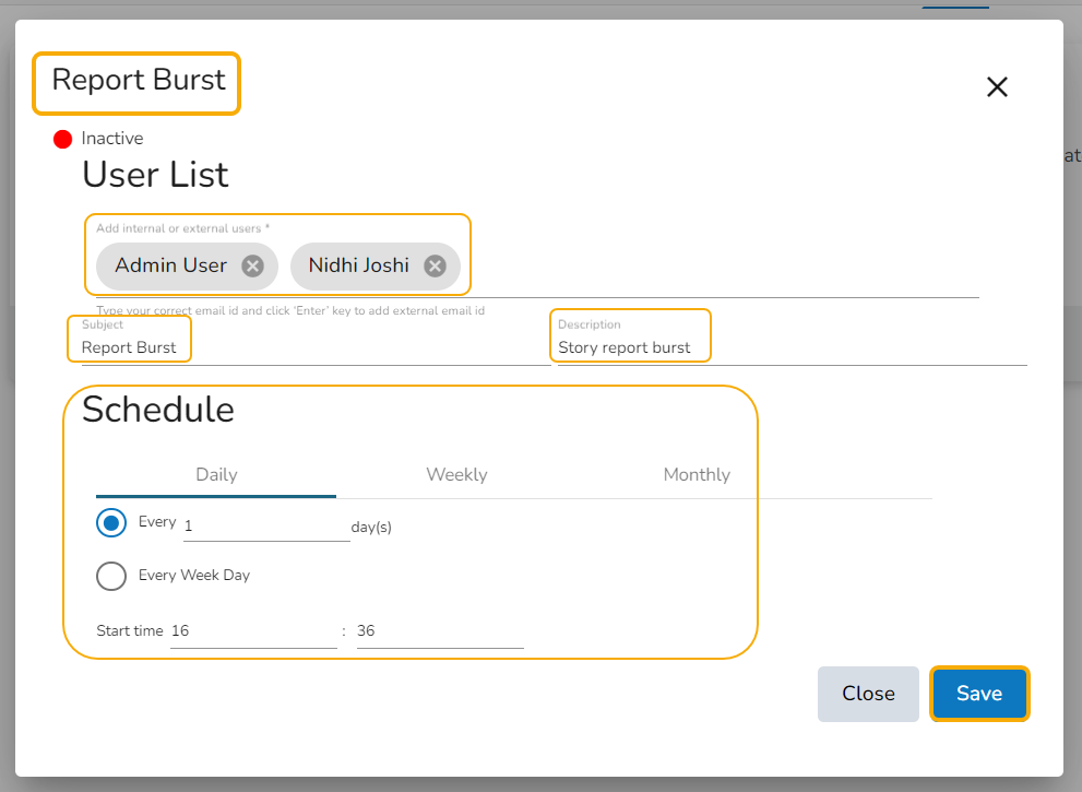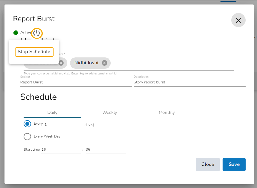 Schedule the selected Report by configuring the time range.