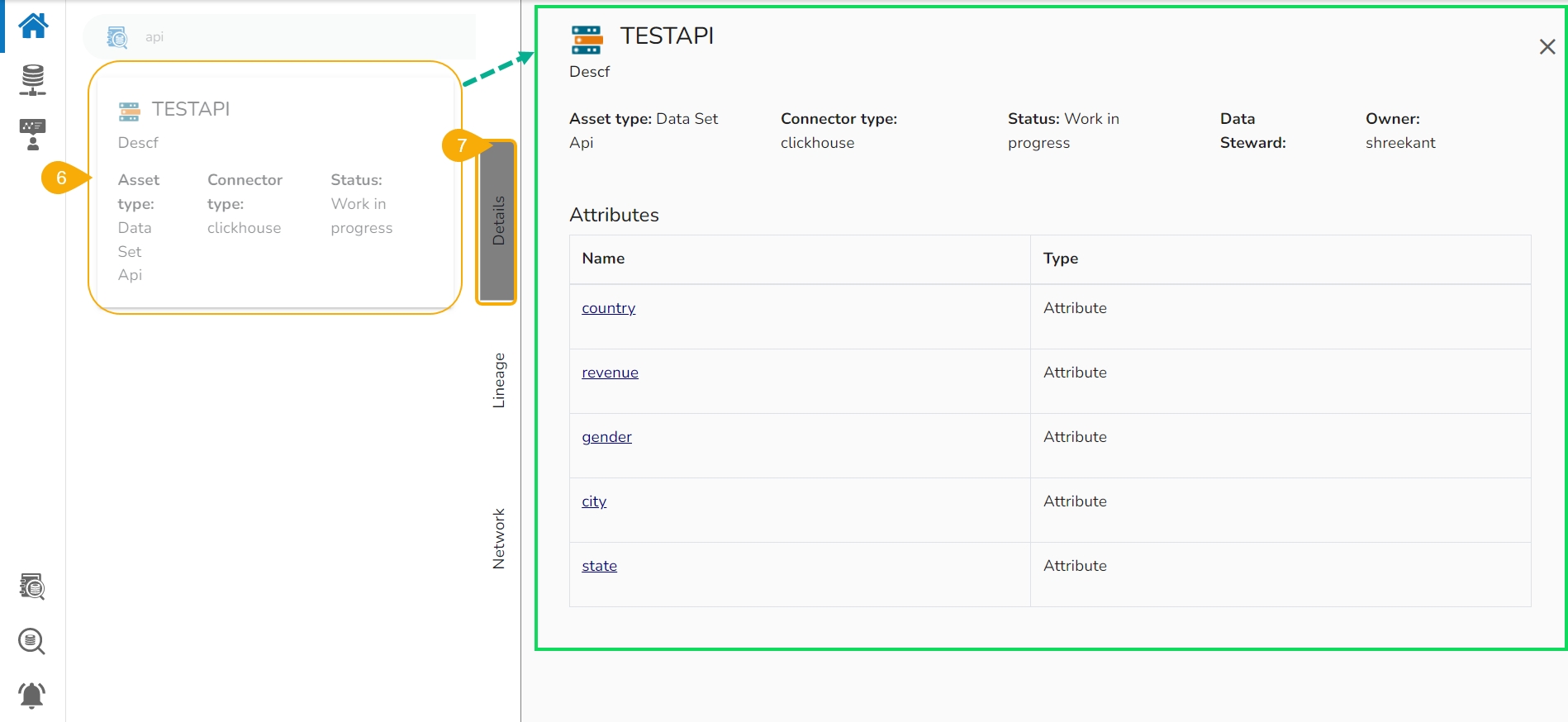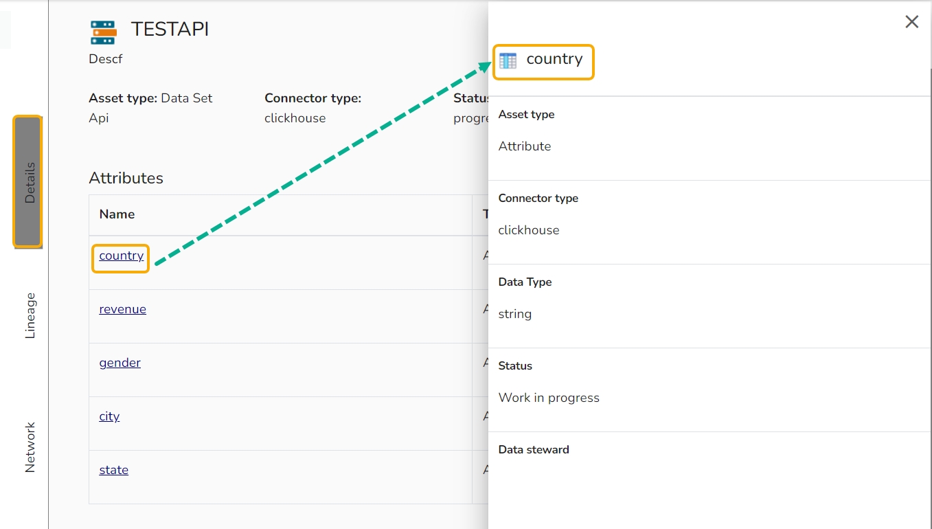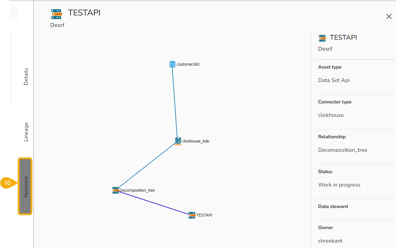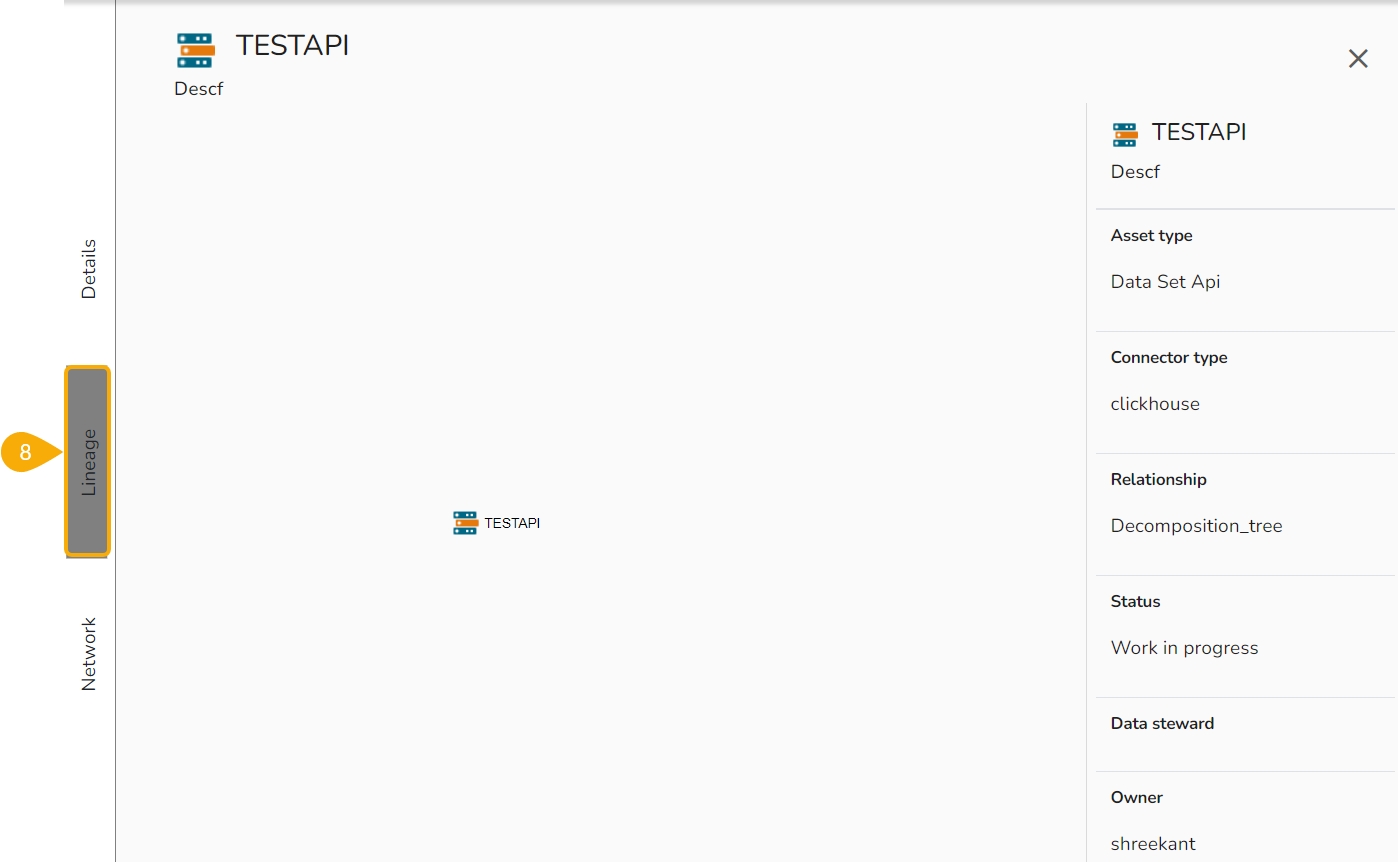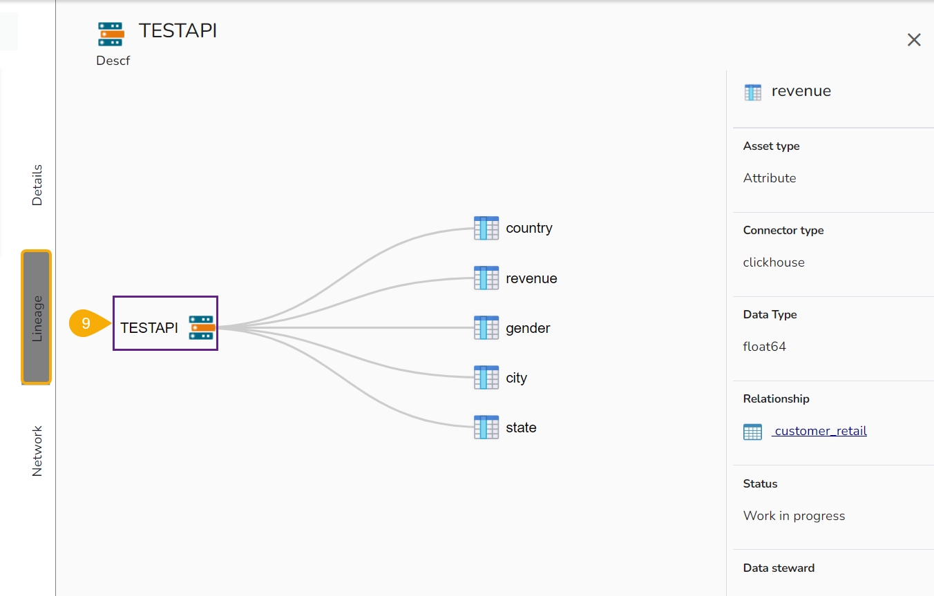 Click on the Lineage tab to open the Data Lineage. This page reveals the relationship between the searched Data Catalog and the base data source.