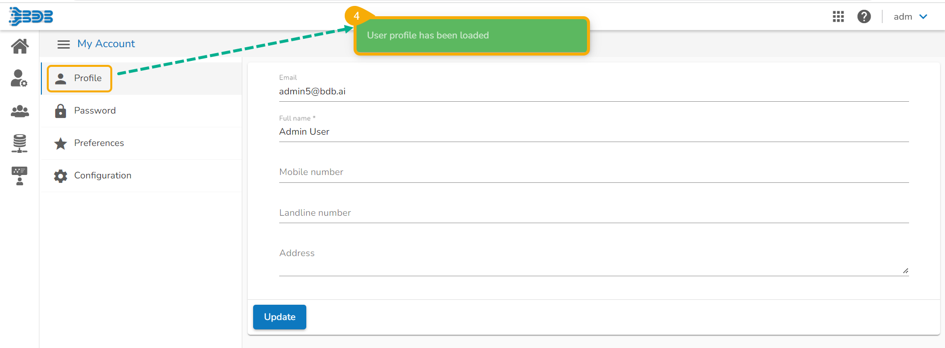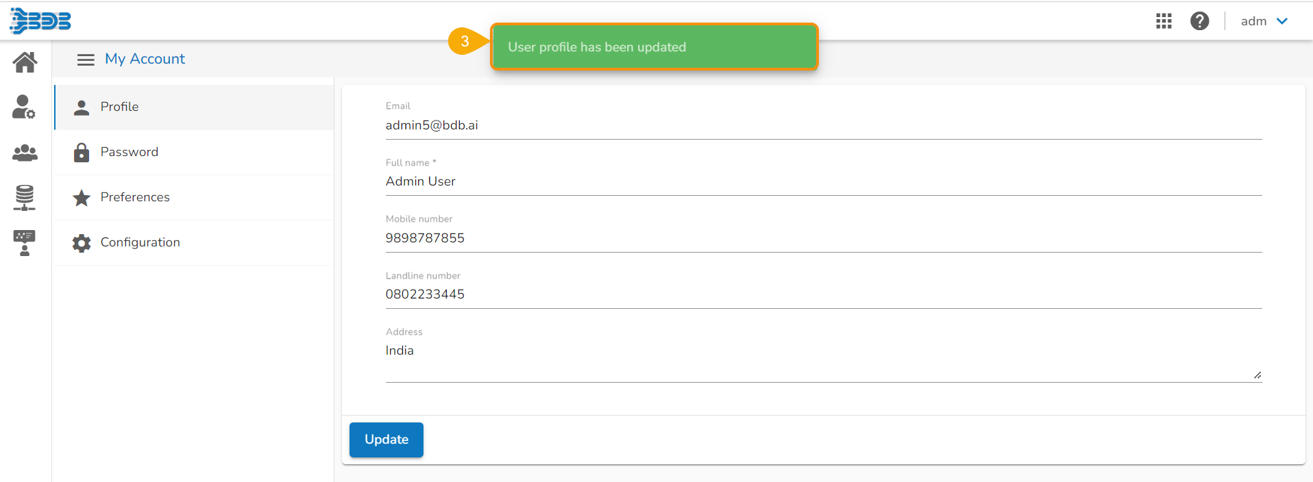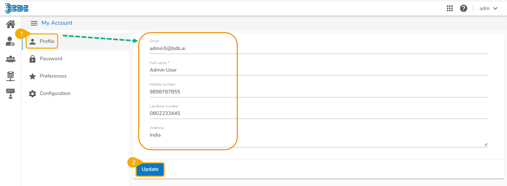 The administrator can edit basic information, set preferences, change the password, set API token access, deregister the mobile device, navigate to the default Platform page, and sign off from the BDB Platform by using the User Profile icon provided on the Platform homepage.