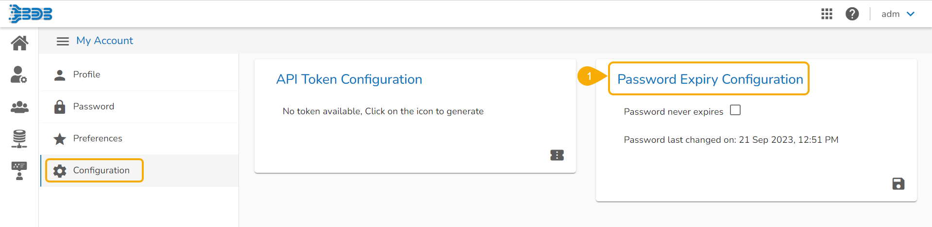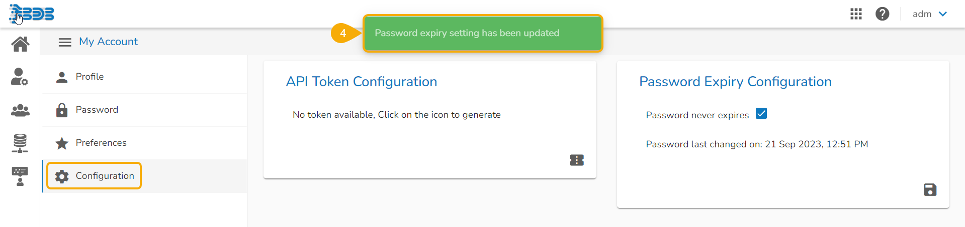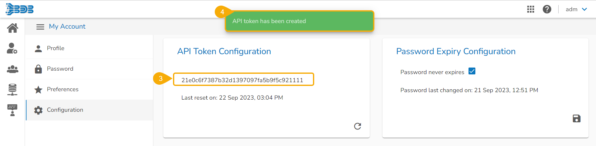 The configuration tab allows the user to create or reset the API Token and set the Password Expiry configuration.