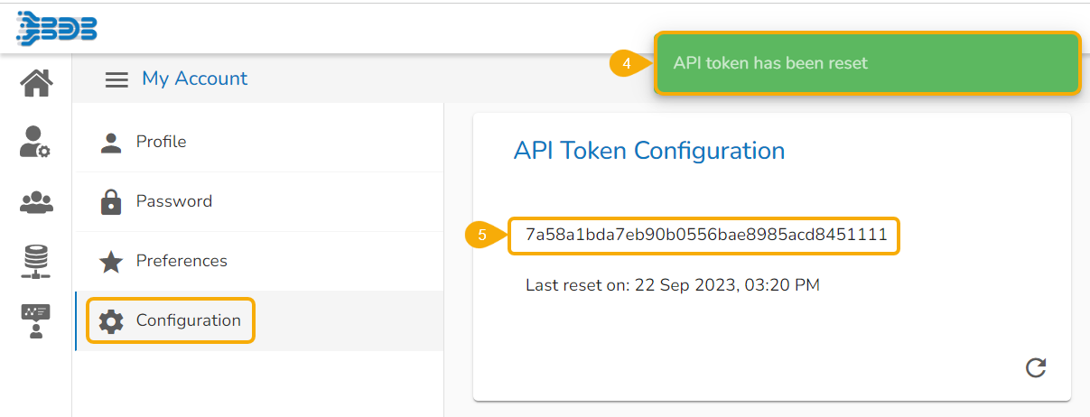 Click the Reset icon from the API Token Configuration window to reset the API Token.