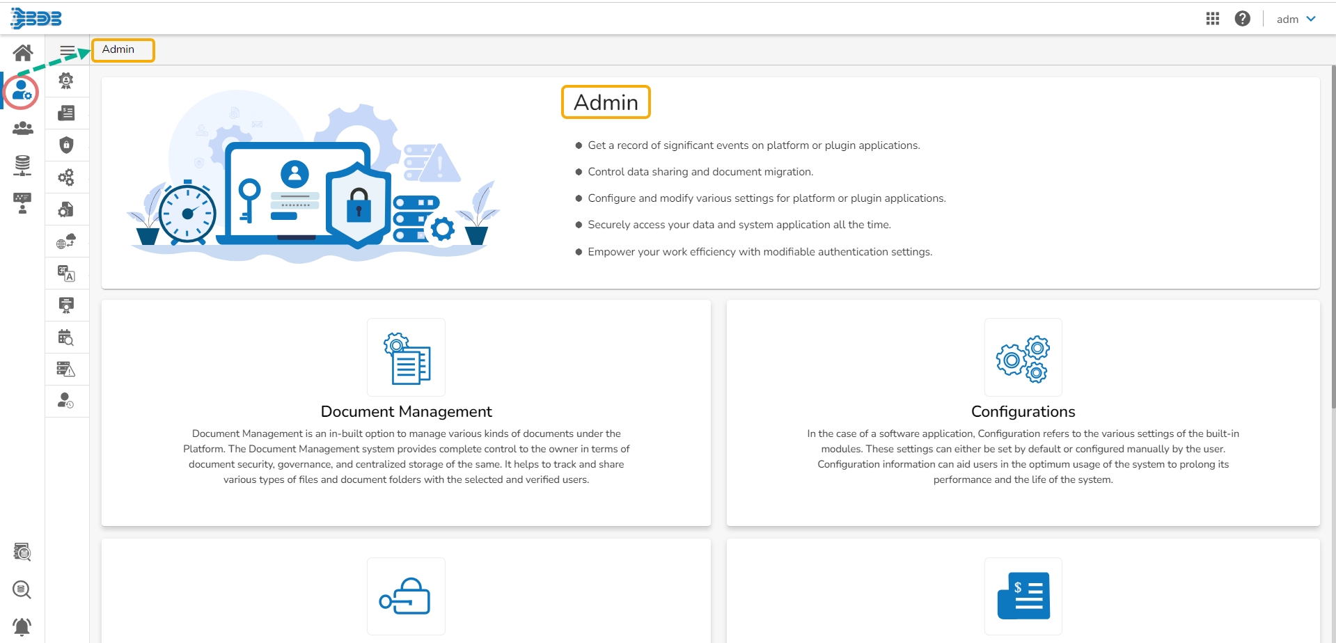 The user can click on a module icon from the left menu panel to get redirected to that module. E.g., In the below-given image by clicking the Admin icon, the user is redirected to the Admin module's homepage.