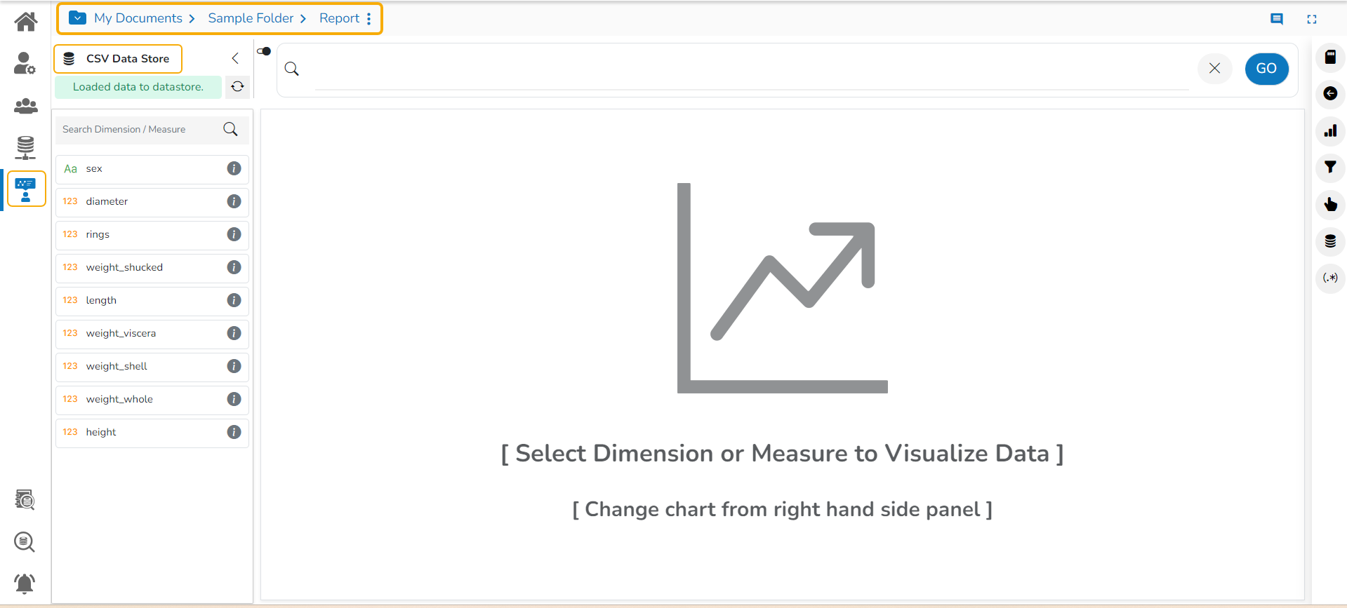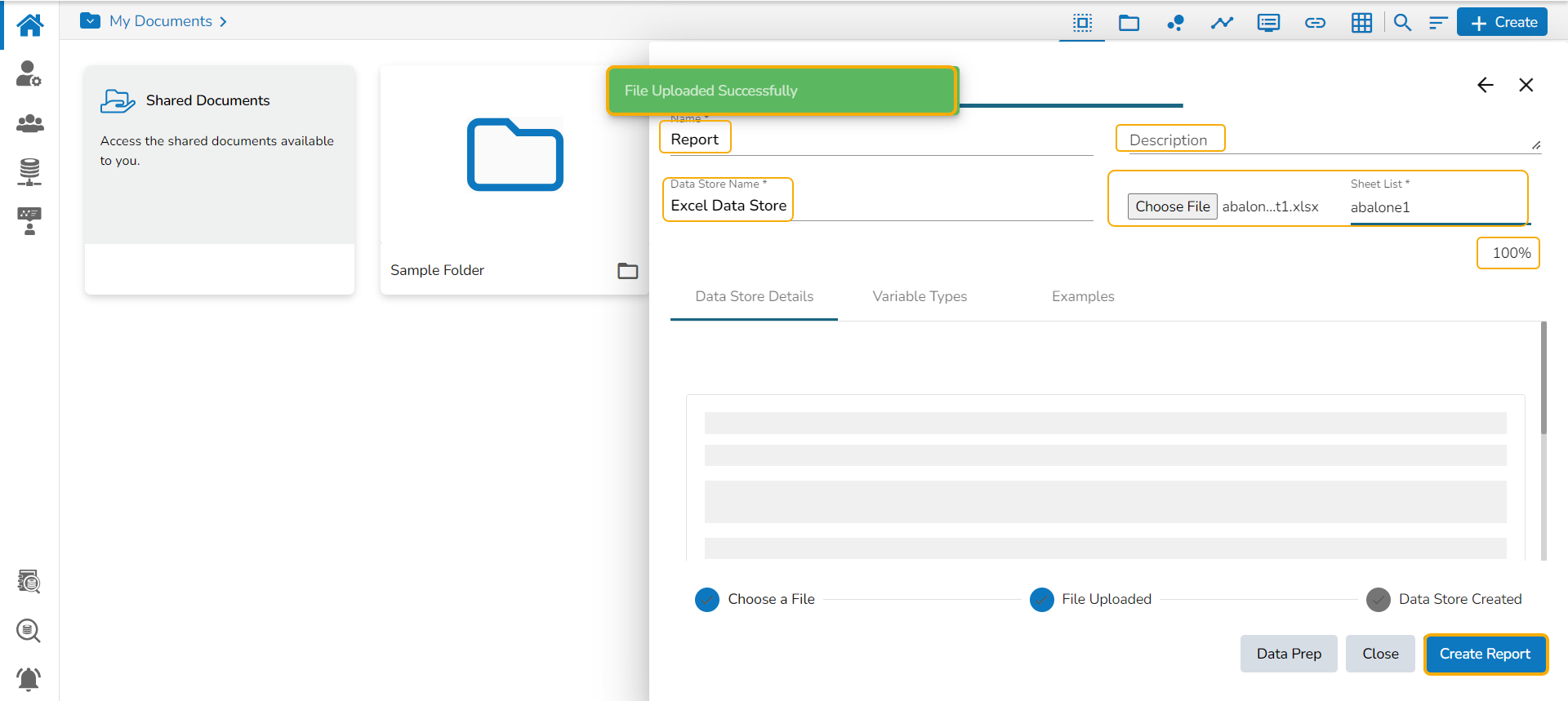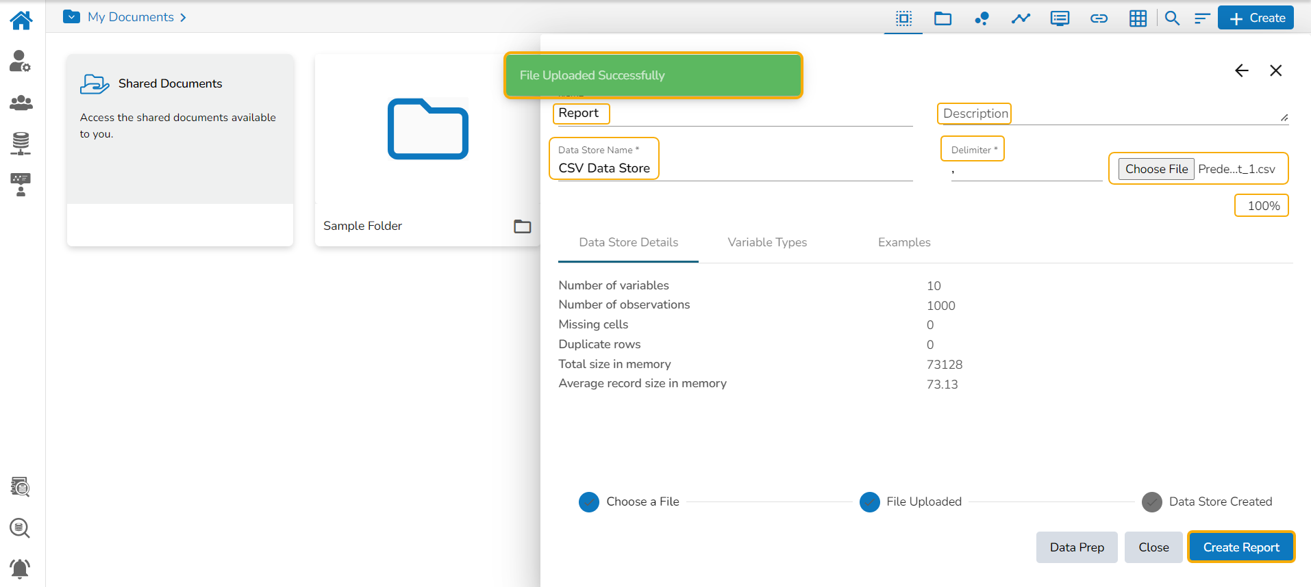 Please Note: After the user clicks the Create New Report option while uploading a CSV or Excel file, a new Data Store gets created. The user gets notified by a confirmation message as shown in the following image and the targeted report gets created.