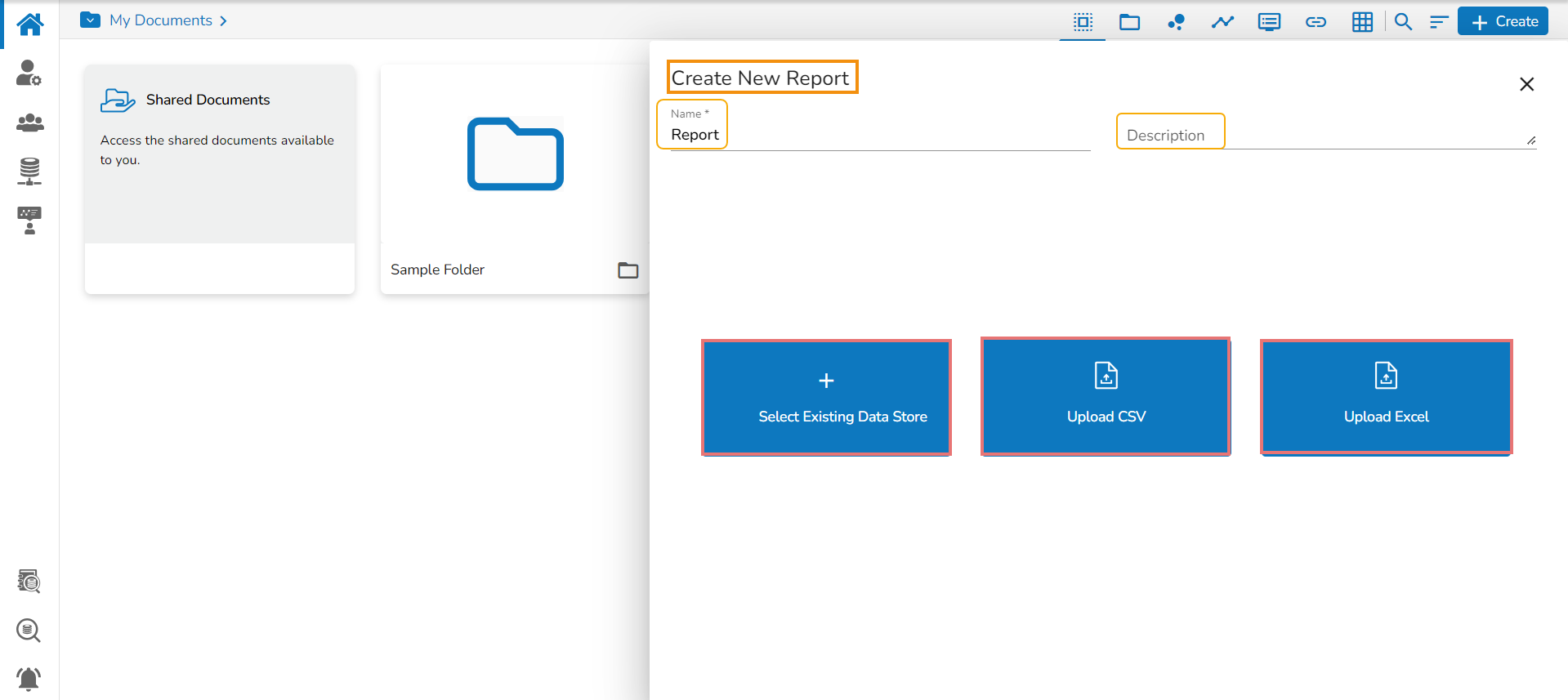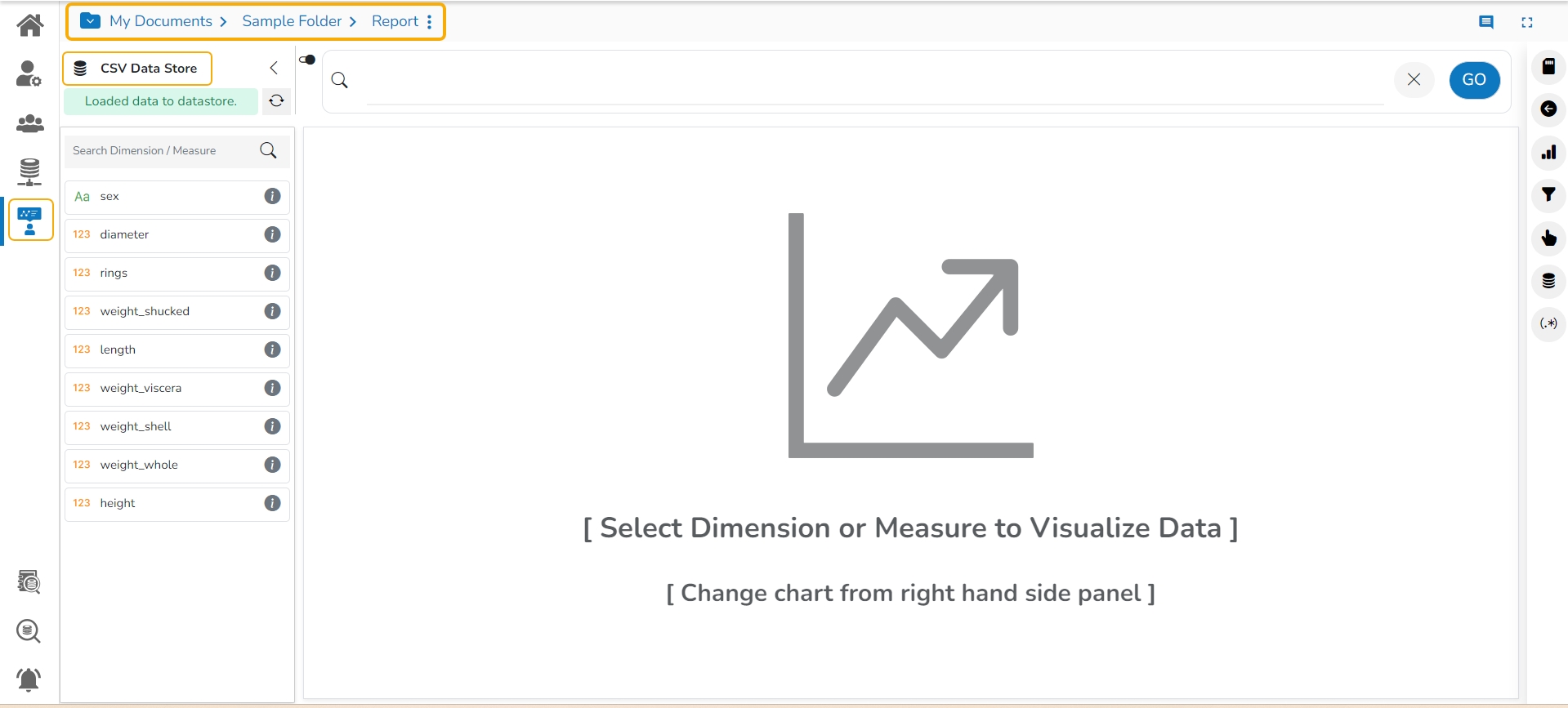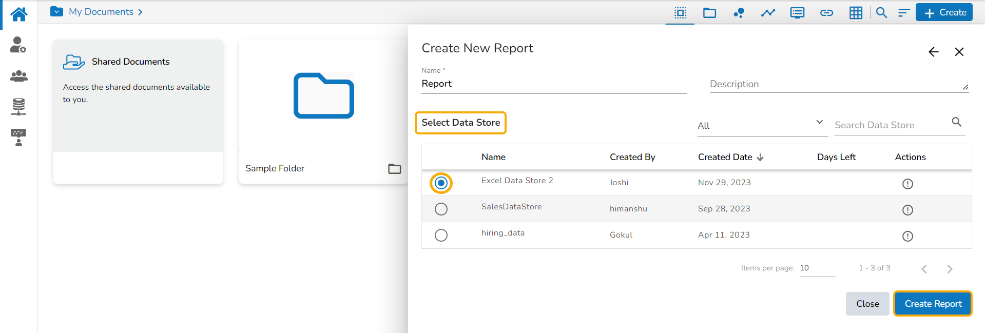 The next screen when an existing Data Store is selected to create Report is displayed in the below-given image.