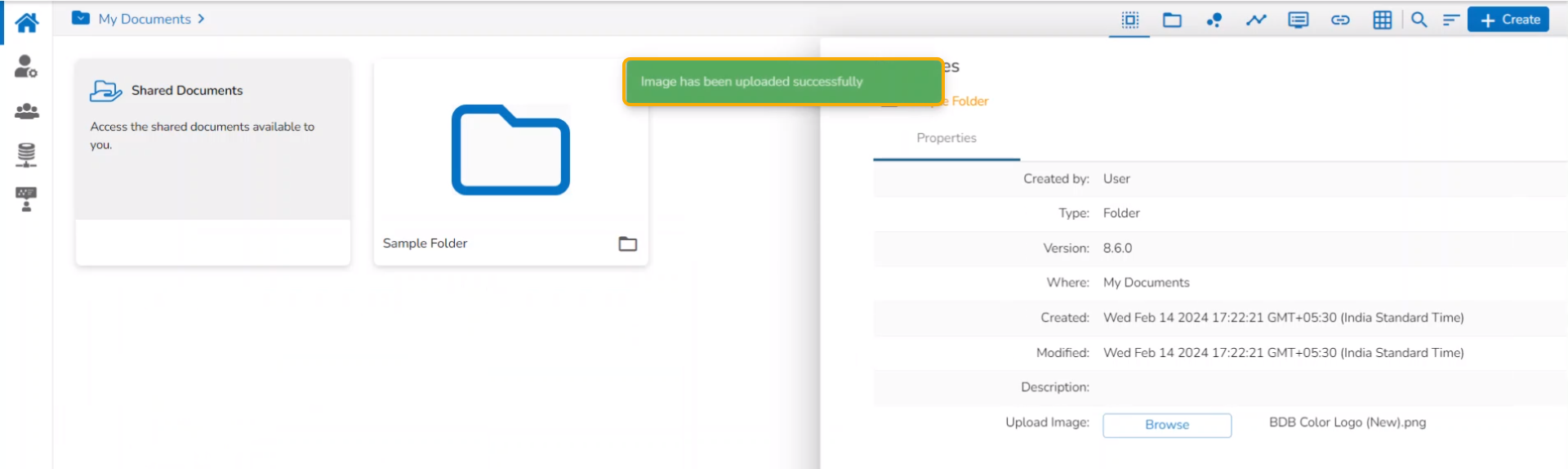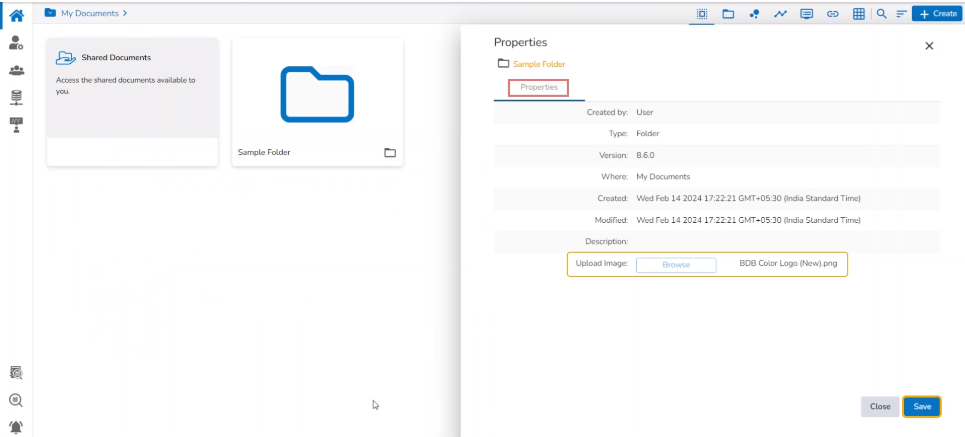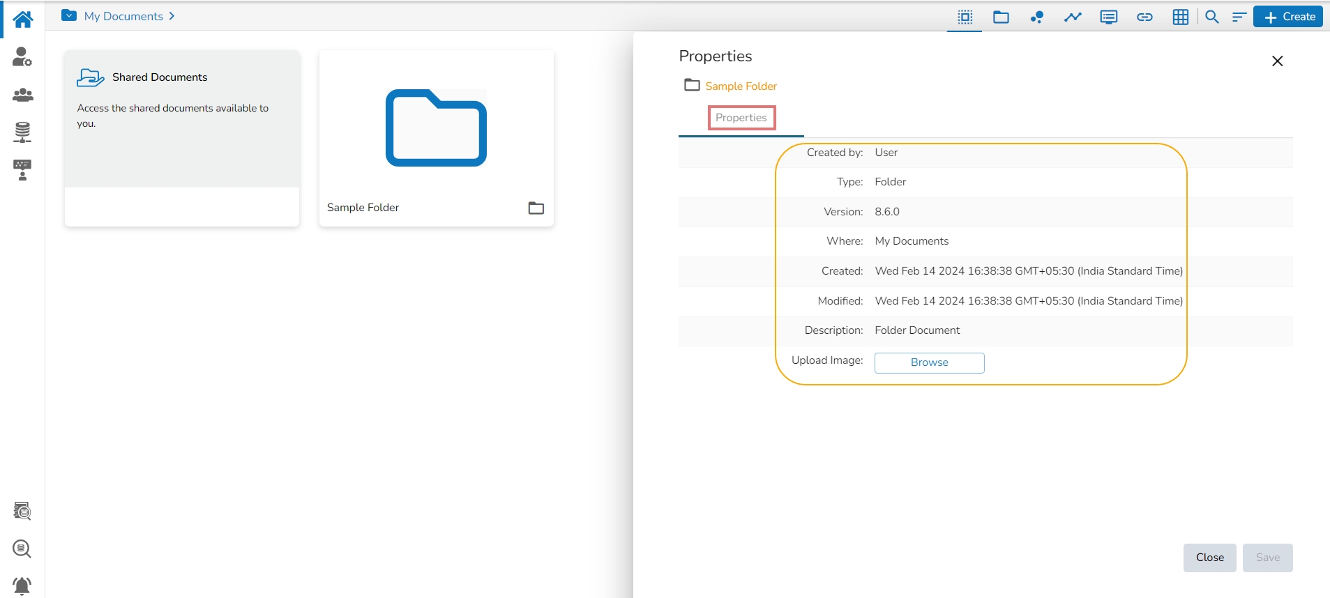 The folder Properties open displaying the name of the creator, document type, version, space, date of creation and date of modification. The inserted description also gets displayed over here. The user can also upload an image using the Properties tab.