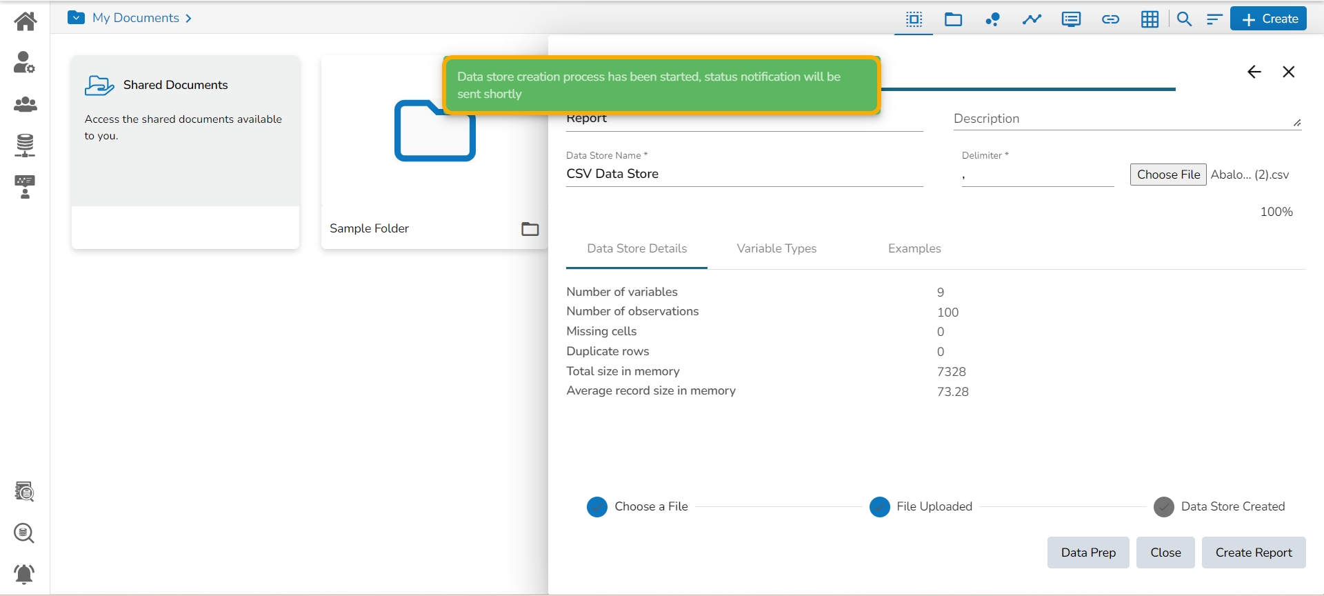 Once the file is chosen, it will display the Data Store details such as Variable Types and Examples tabs, and a confirmation message appears to notify the user for the successful update of the file.
