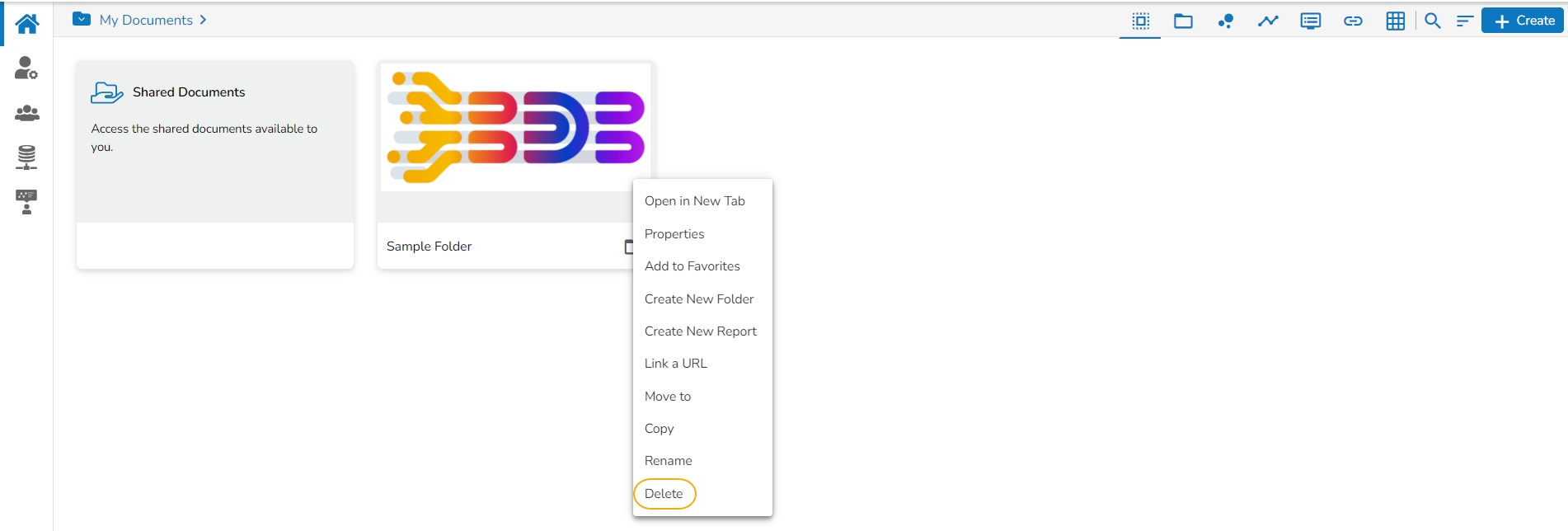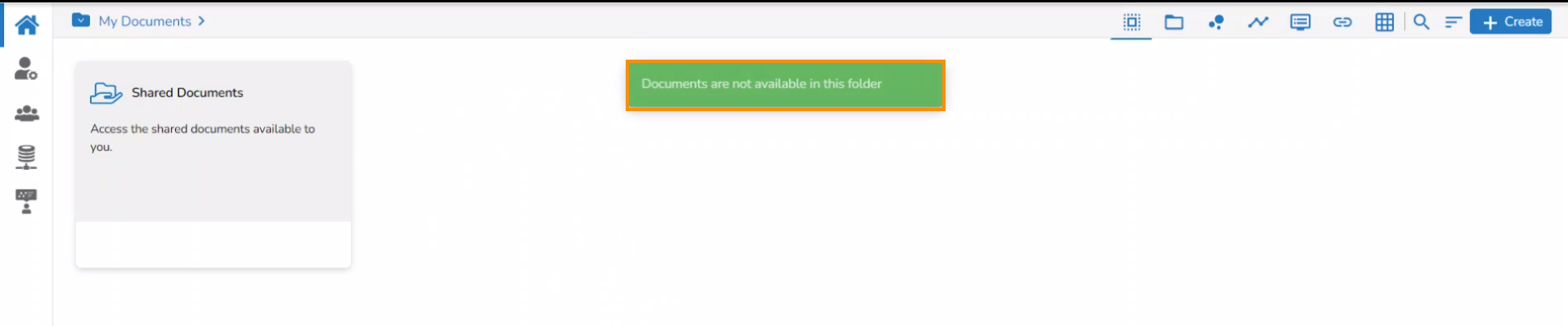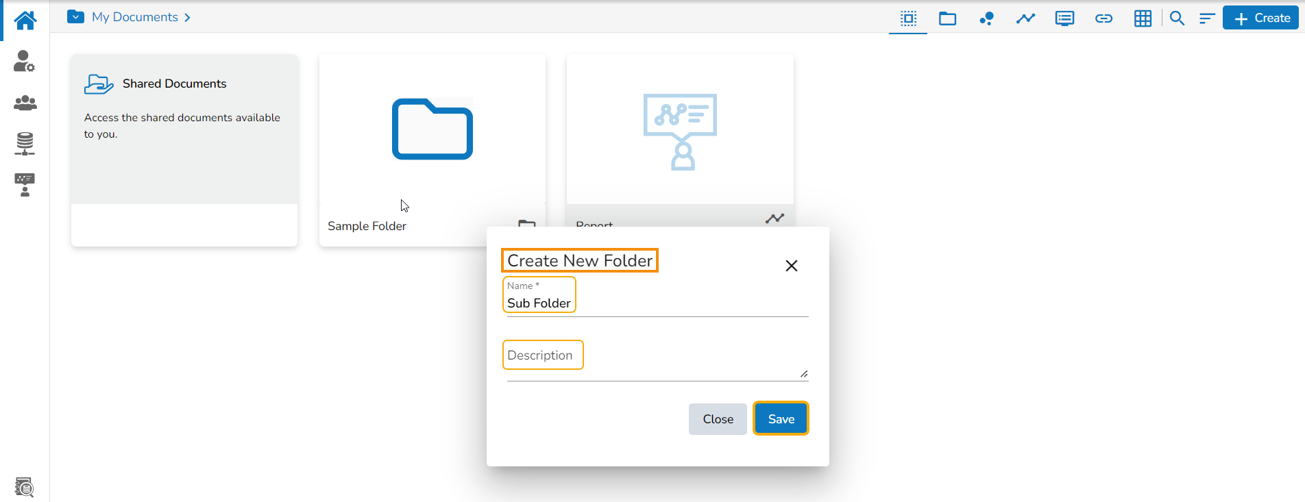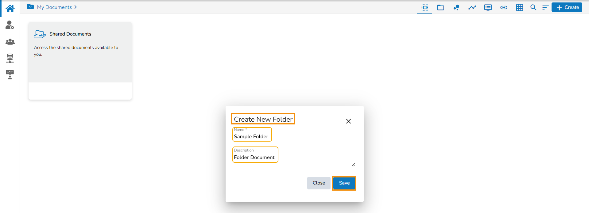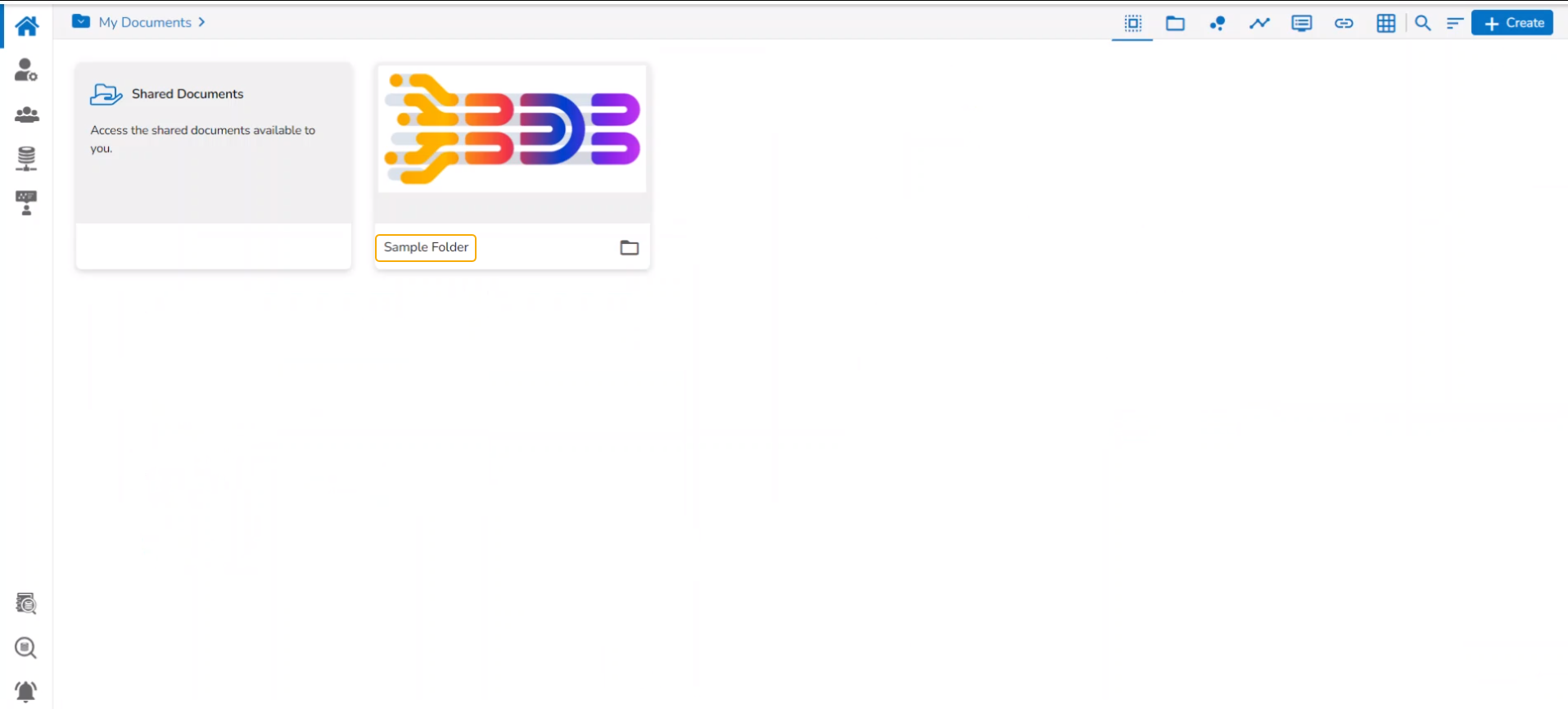 The user can create a folder under the My Documents space and access a publicly available folder under the Public Documents space whereas the Shared folders will be listed under the Shared Documents.