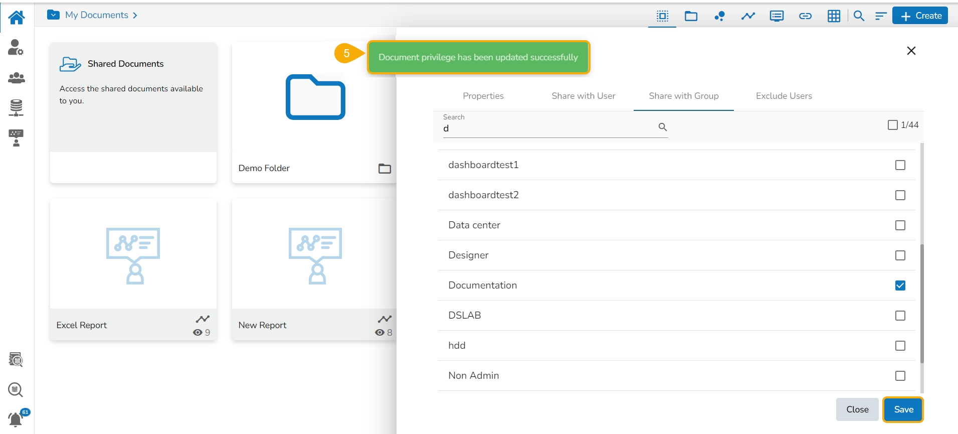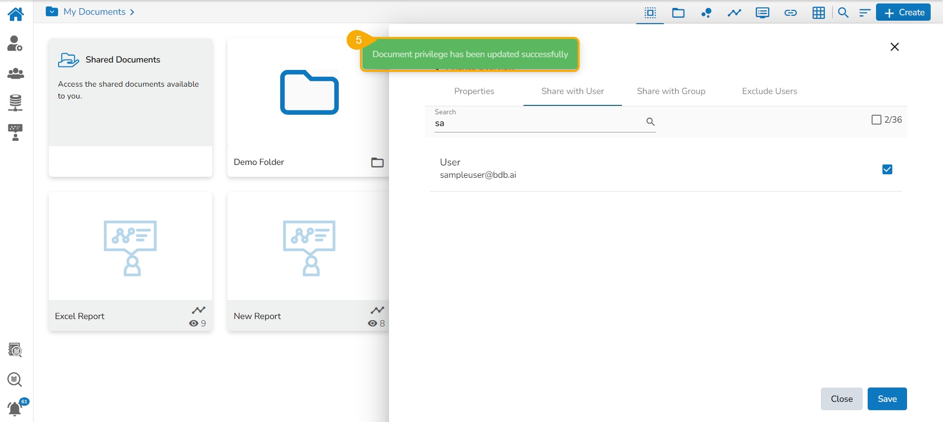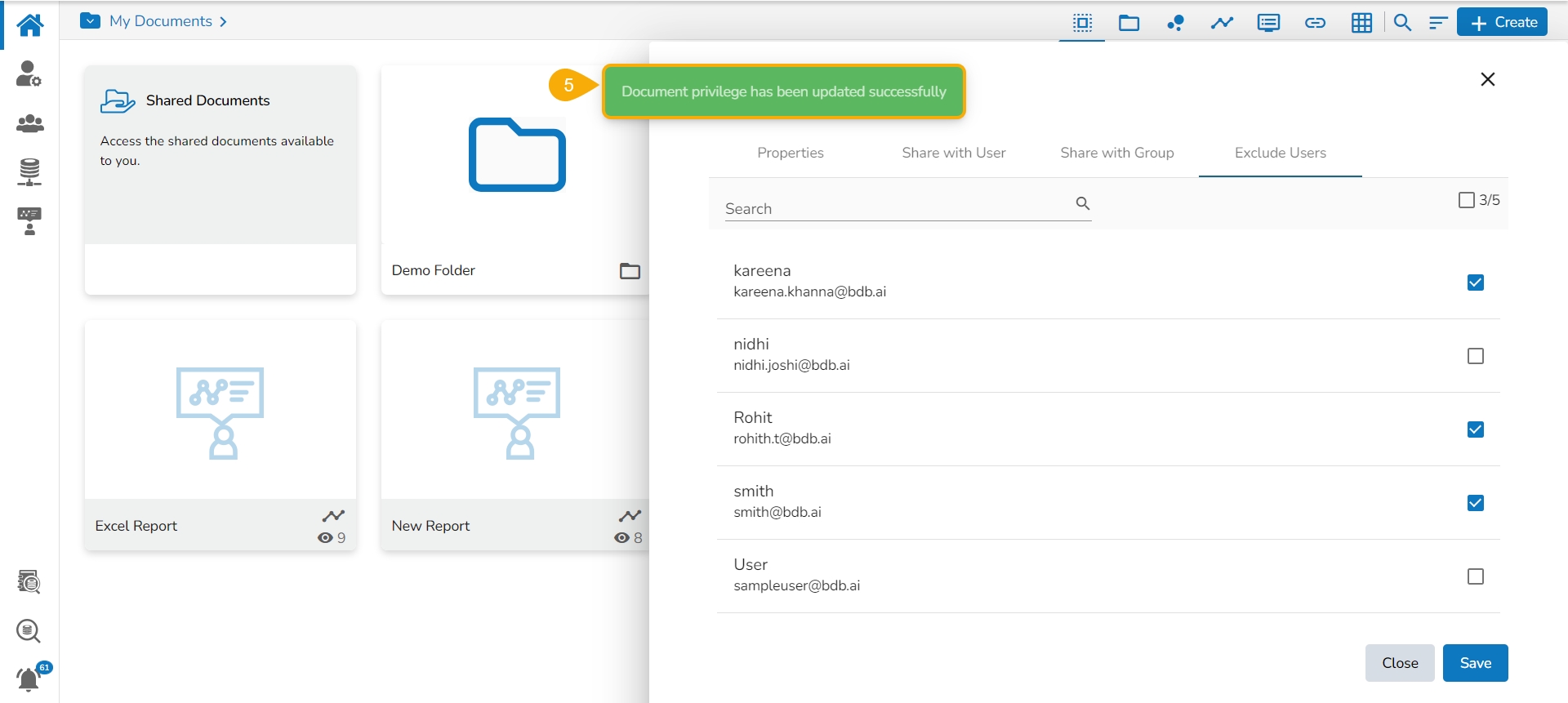 A success message appears, and the document privilege gets updated to exclude the selected user(s).