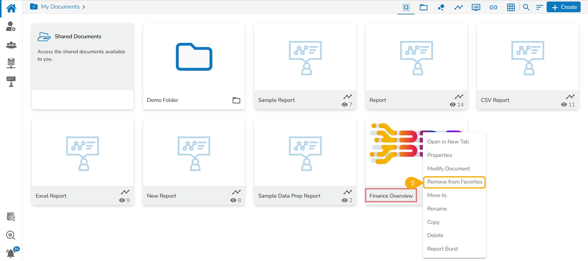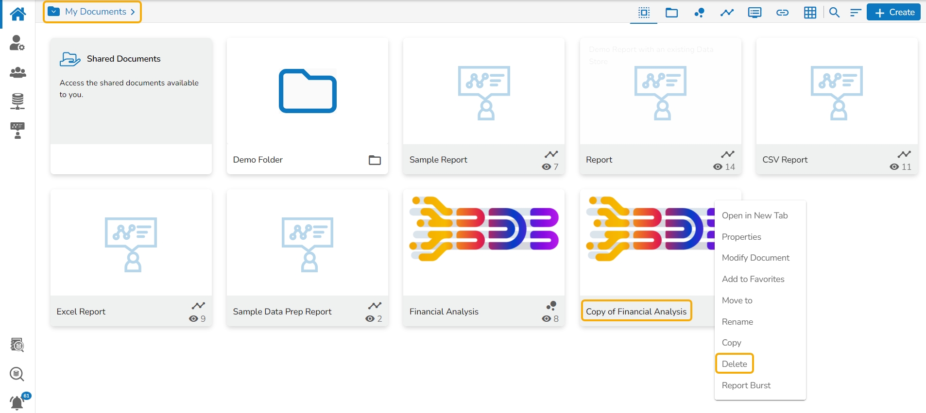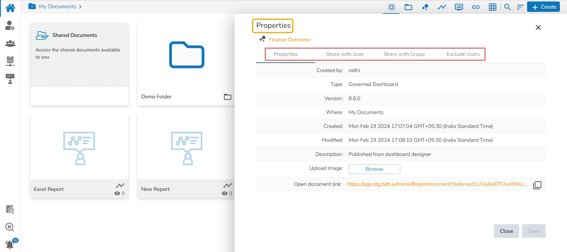 The Report Burst operation allows the user to share the open document link of a Dashboard to another user(s). The feature appears under the Properties option provided for a story created or shared under the Public Documents space.
