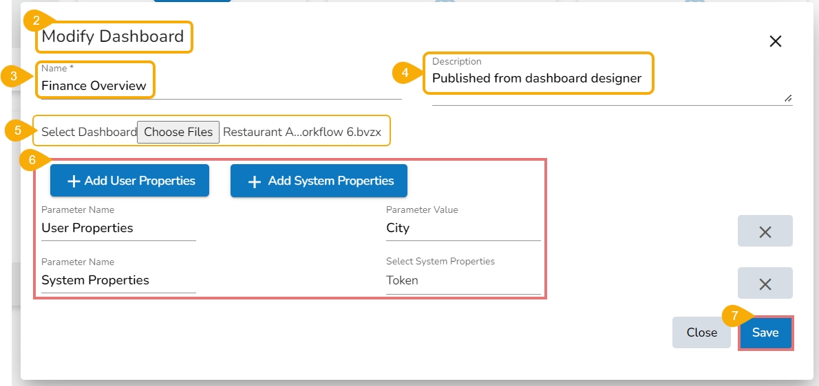 Click the Add User Properties or Add System Properties option to add dashboard parameter(s).