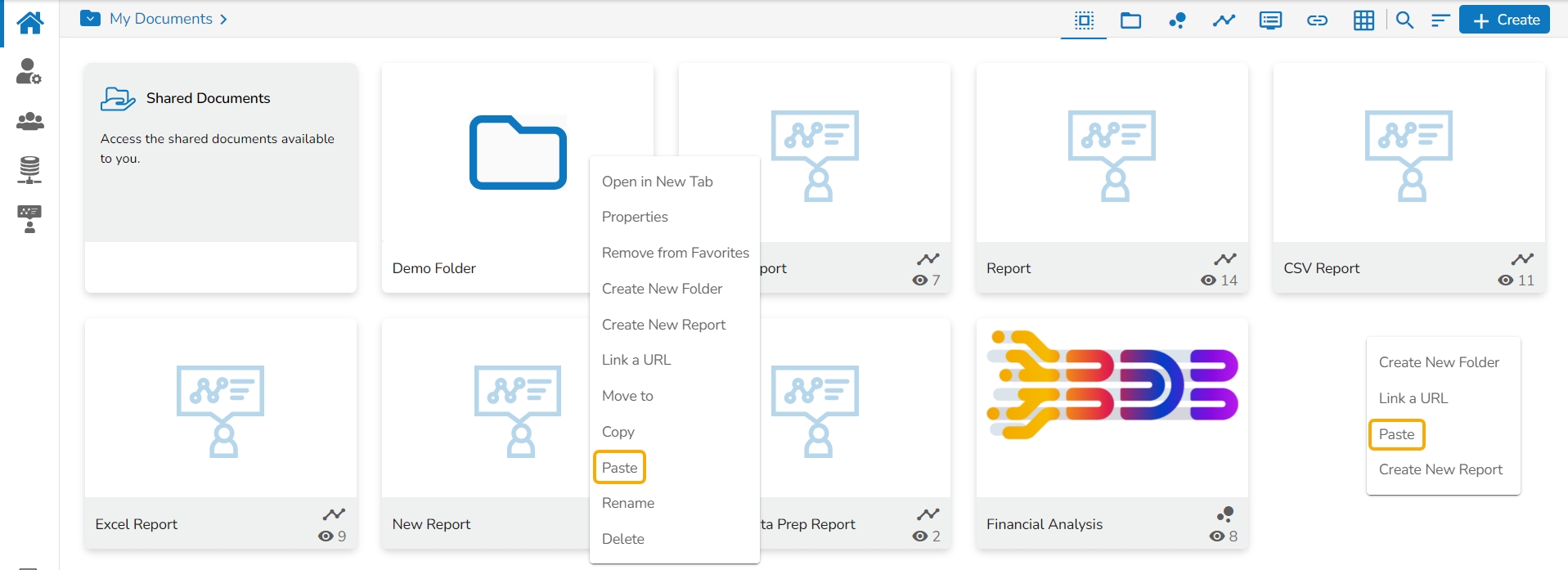 Administrators can copy an existing dashboard and paste it at any chosen place within My Documents or Public Documents of the platform.