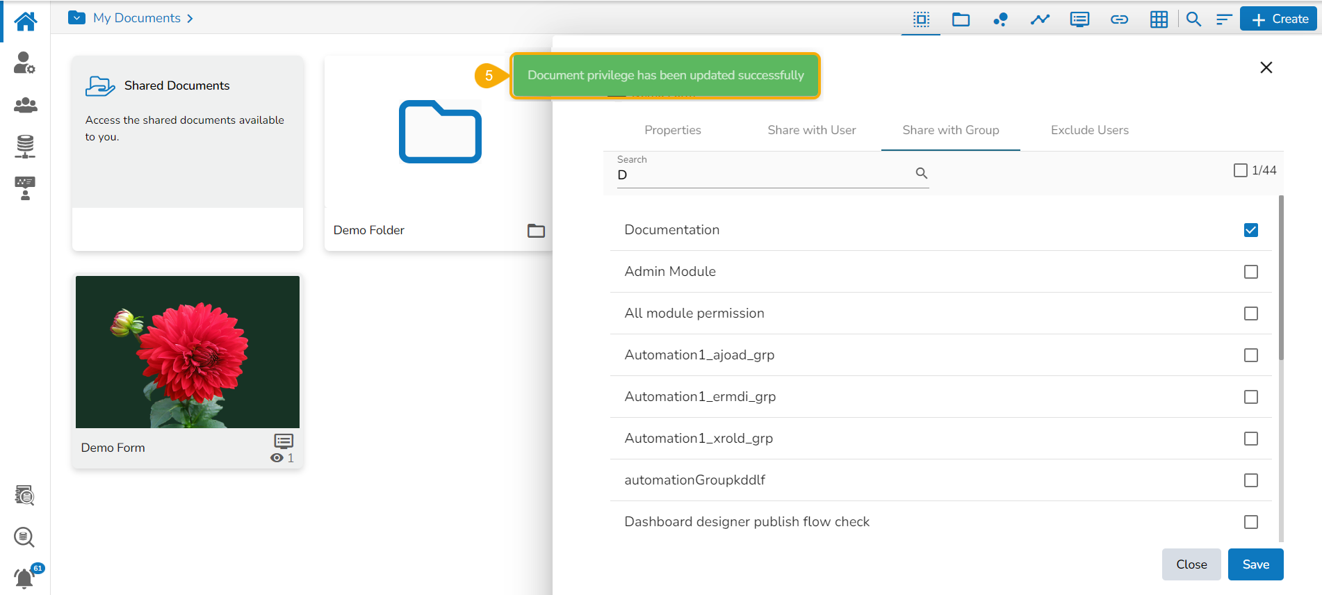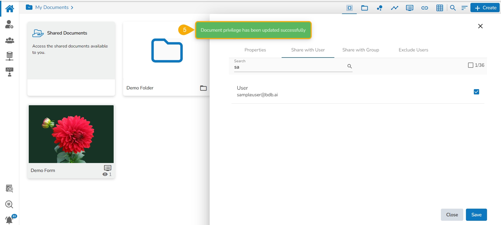 A success message appears, and the document privilege gets updated to exclude the selected users.
