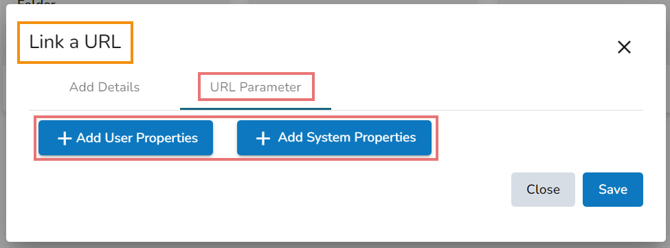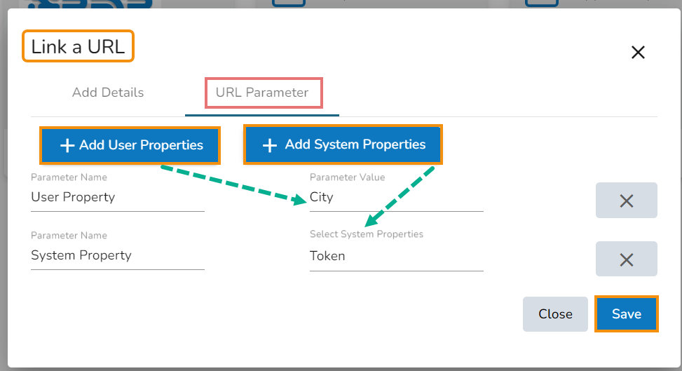 By choosing the System Properties option, it requires the administrator to select an option from the available system properties drop-down menu. (E.g., in the below-given image, parameter Param 2 passes the authentication Token as system properties to link the URL).