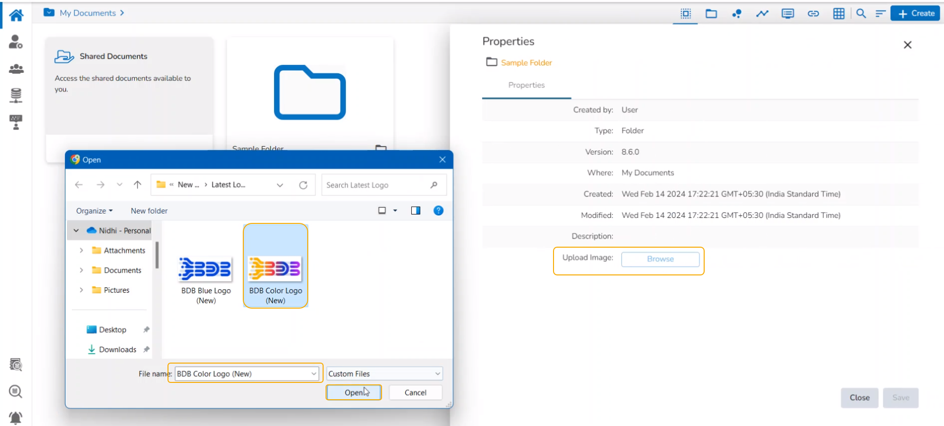 The folder Properties opens displaying the creator's name, document type, version, space, date of creation, and modification. The inserted description also gets displayed over here. The user can also upload an image using the Properties tab.