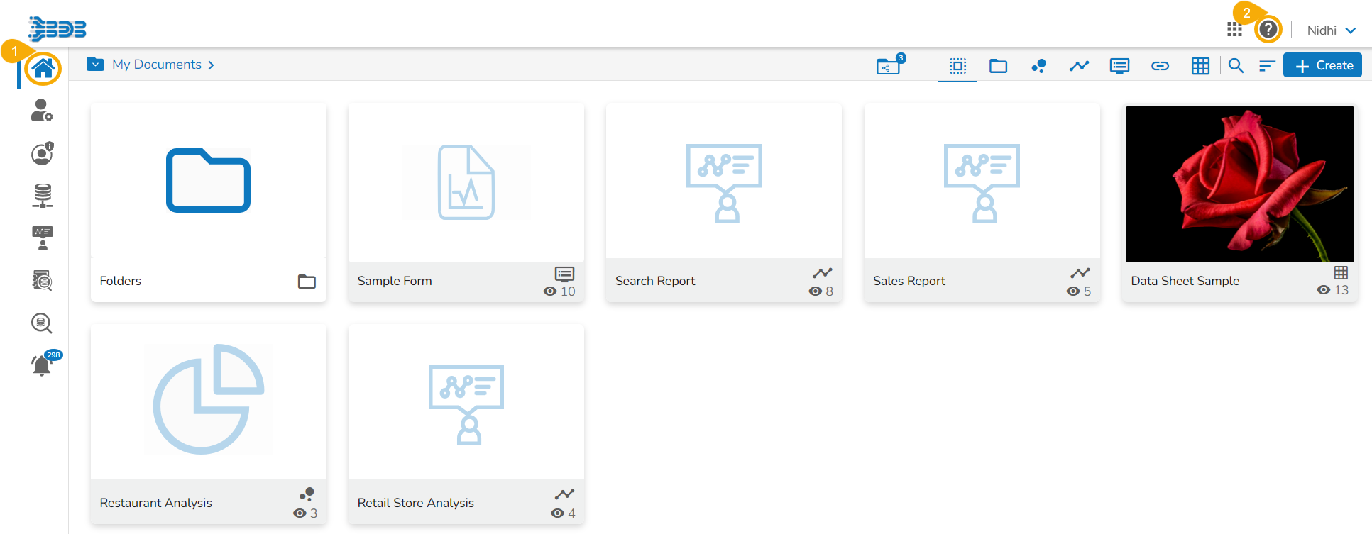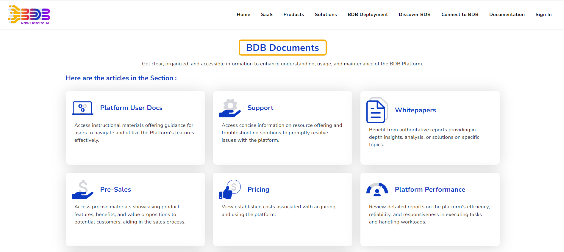 * E.g., by selecting the ***Documentation*** option the user gets directed to the [***Documentation***](https://bdb.ai/docs) page from where the latest Platform related documents can be accessed.  &#x20;