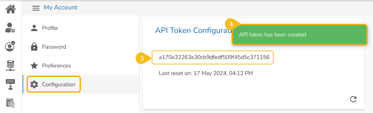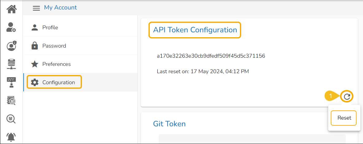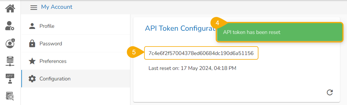 Click the Reset icon from the API Token Configuration window to reset the API Token.