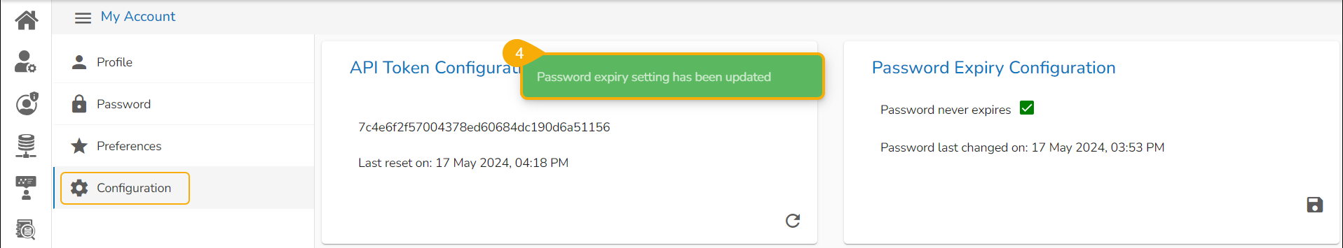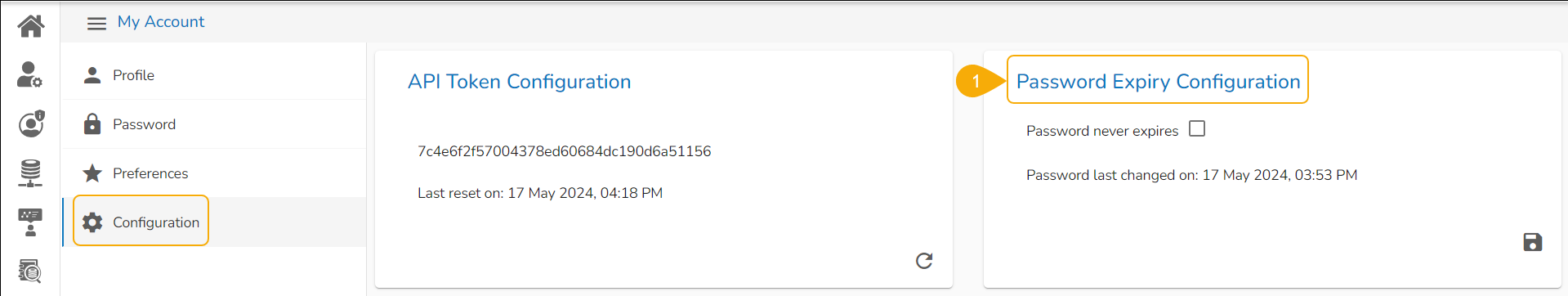The Configuration tab allows to create or reset the API Token and set the Password Expiry configuration.