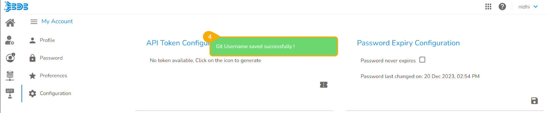 A notification message appears to ensure that the Git Token has been saved.