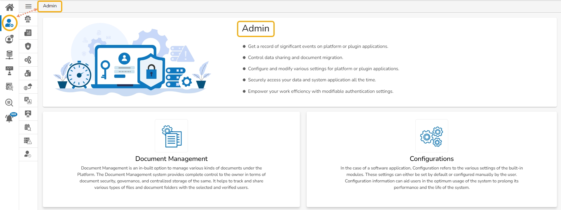 The user can click on a module icon from the left menu panel to get redirected to that module. E.g., In the below-given image by clicking the Admin icon, the user is redirected to the Admin module's homepage.