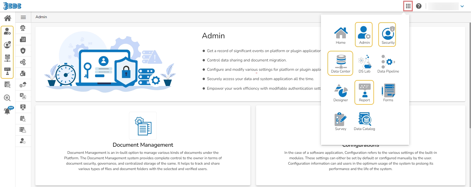 The Platform Homepage displays icons of the Admin, Security, Data Center, and Report modules on the homepage to make them easily available for the user.