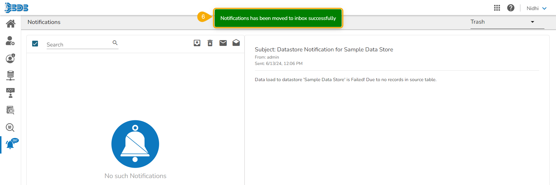 The notifications under the Trash folder get displayed (by default the latest notification opens in details).
