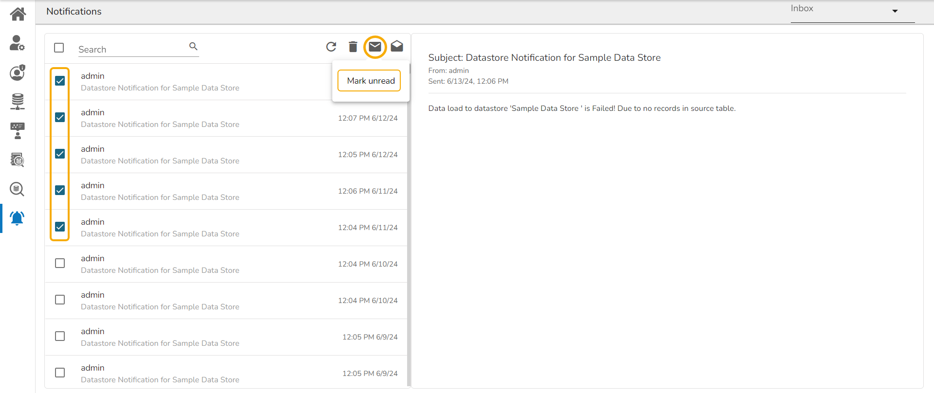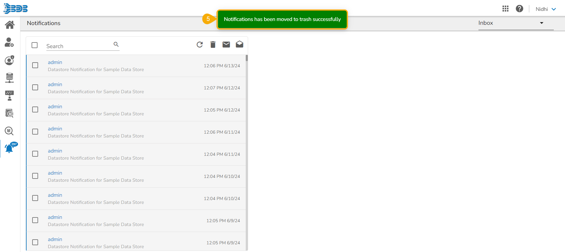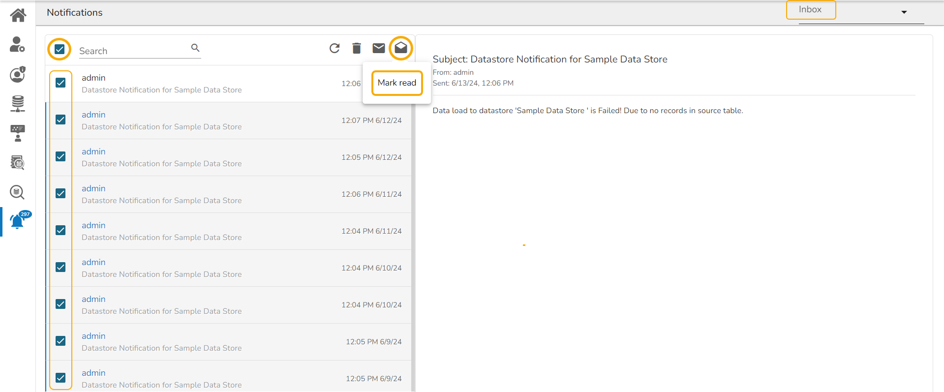Navigate to the Inbox page and select the notification messages either by using the checkbox provided for Select All or selecting the individual messages by using the checkboxes next to them.