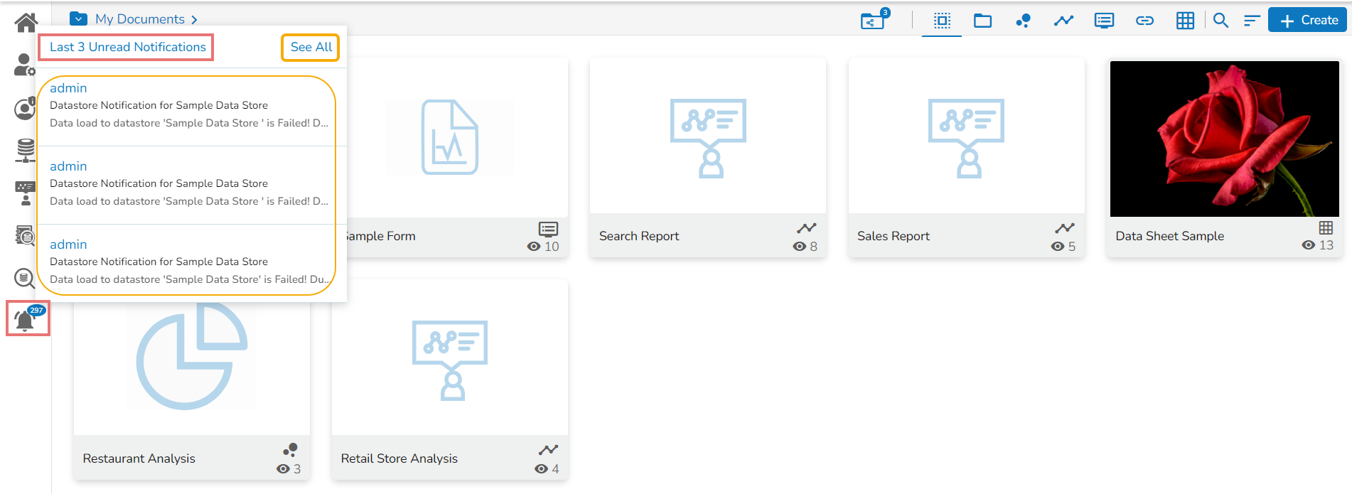 The left panel contains the Notification icon. The number of notifications displayed at the top of the Notification icon indicates the unread notification messages.