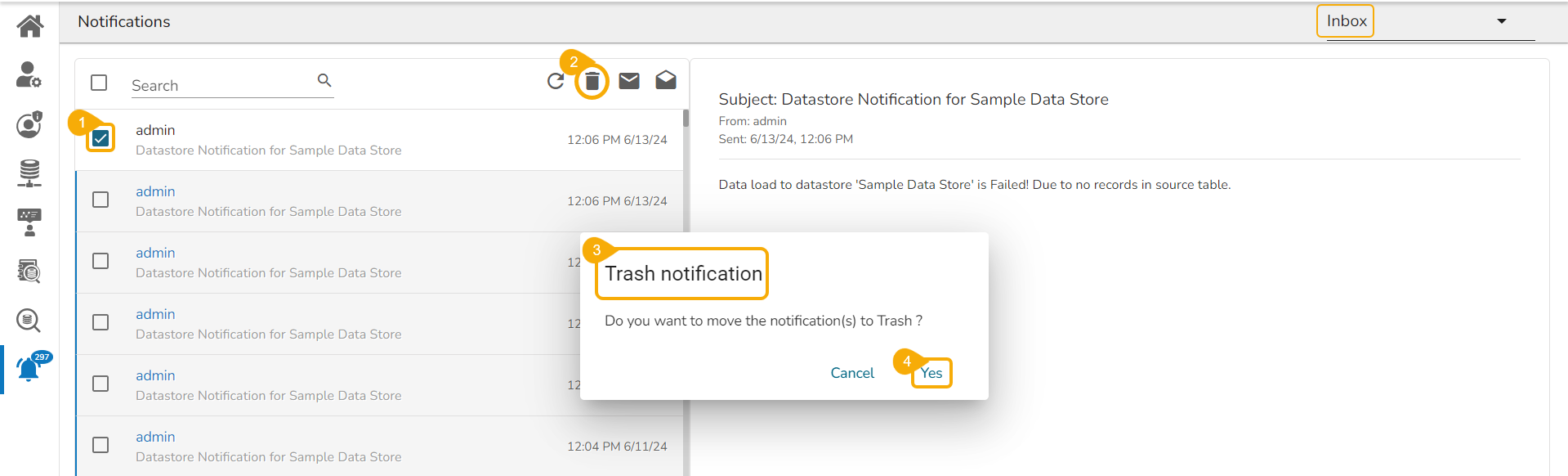 A dialog box appears to confirm from the user's end to move the selected notification to Trash.