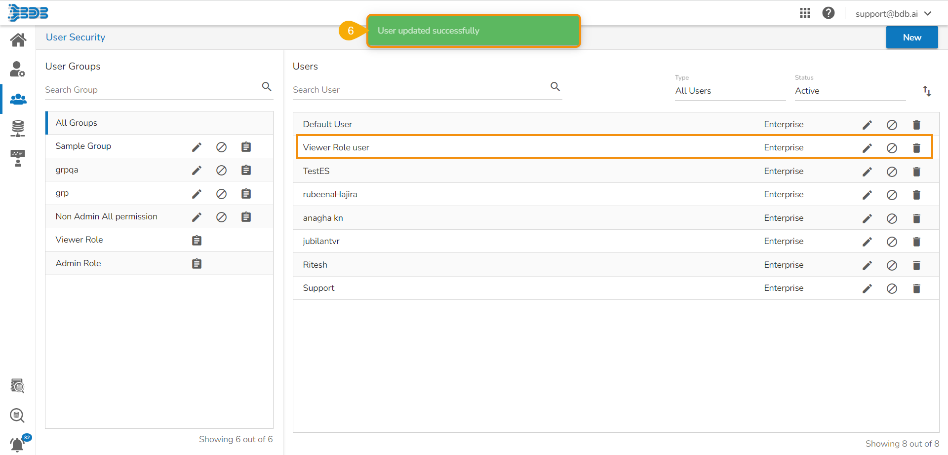 * The newly created user or the selected existing user appears as a part to the Admin Role group.
