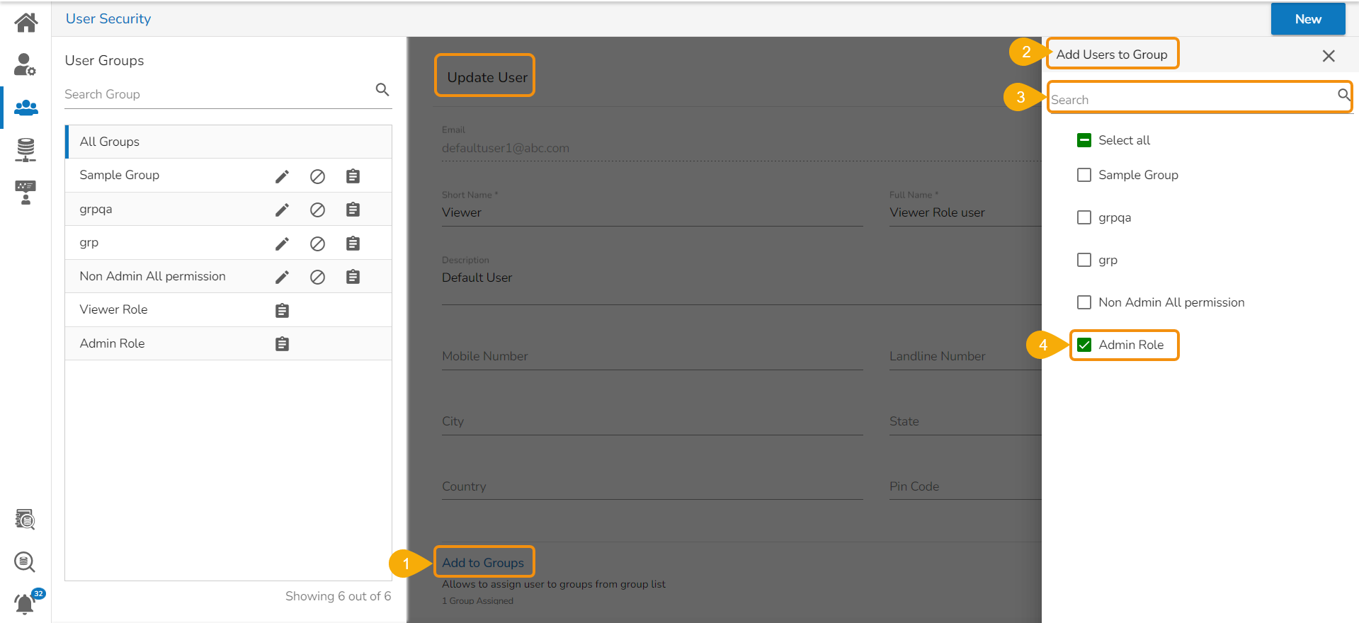 * Open the ***Admin Role** group* from the ***User Groups*** list.