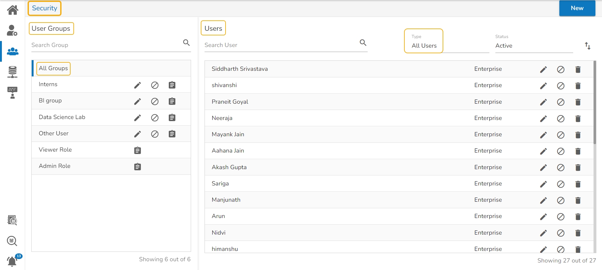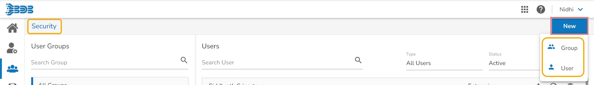 The user can go ahead with the creation of a Group or User by clicking the New menu option.