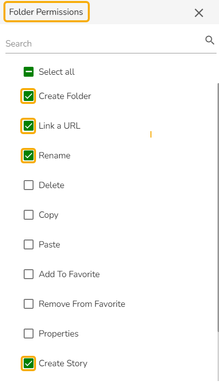 The Folder Permissions window opens with the list of the Folder Permissions to be selected for the group.