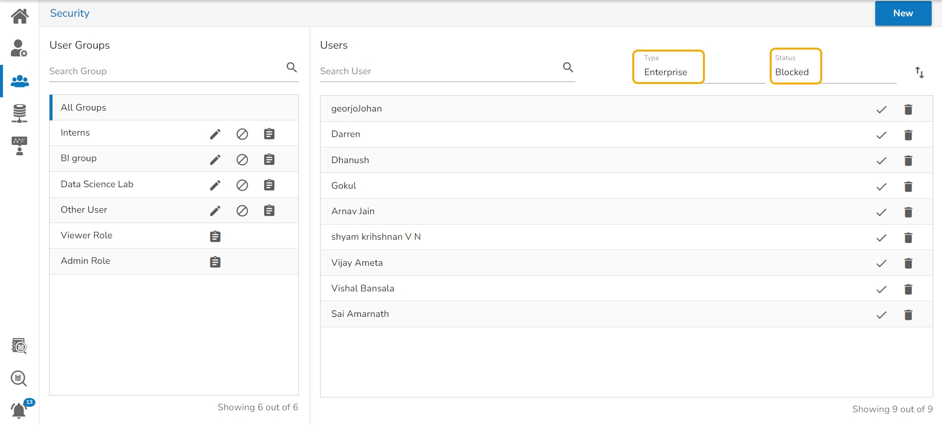 You can select any combination of the filter values mentioned above to display filtered/customized lists of users. E.g., The given image displays a filtered user list with all the Enterprise users with Blocked Status.