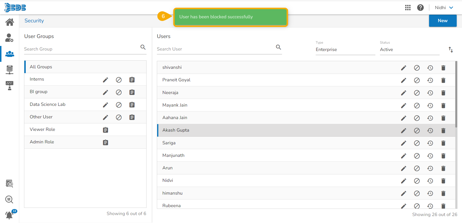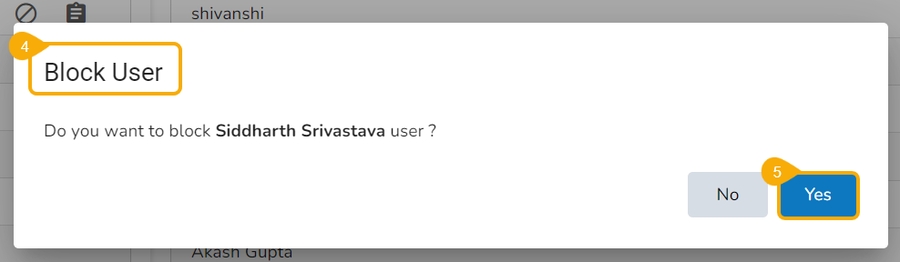 A notification message appears, and the selected user gets removed from the Active Users list.