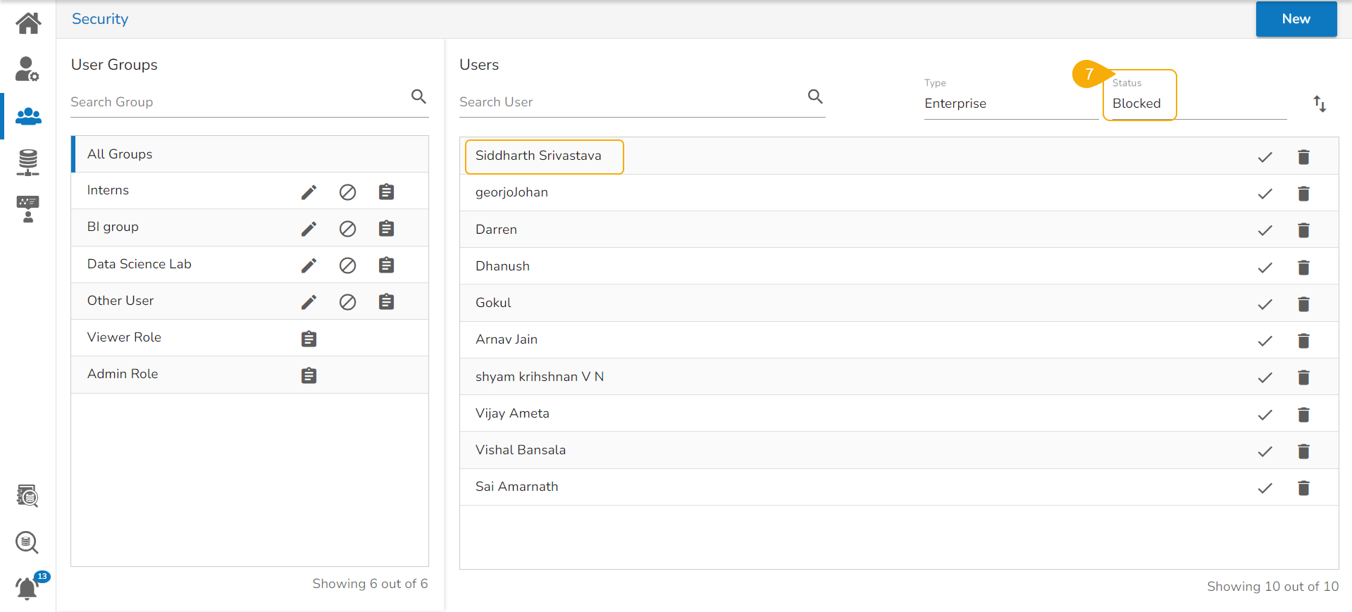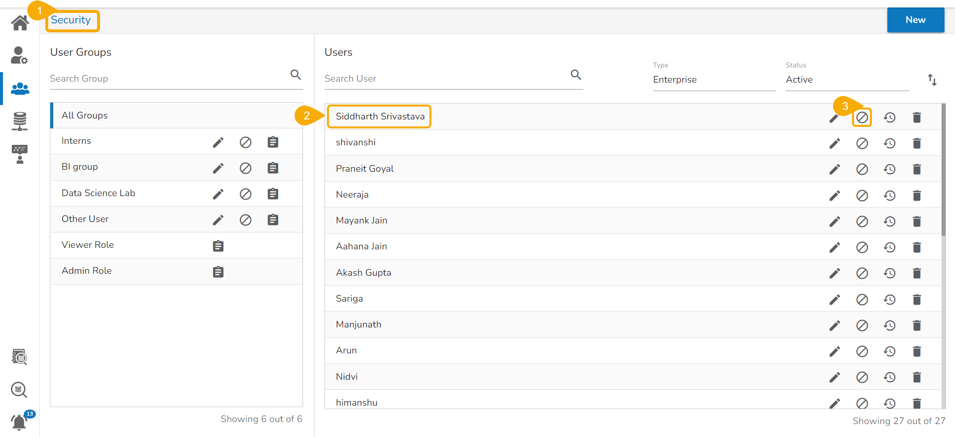 Select a user from the Users list. (By default, the Users list displays All Users type listing Active users)