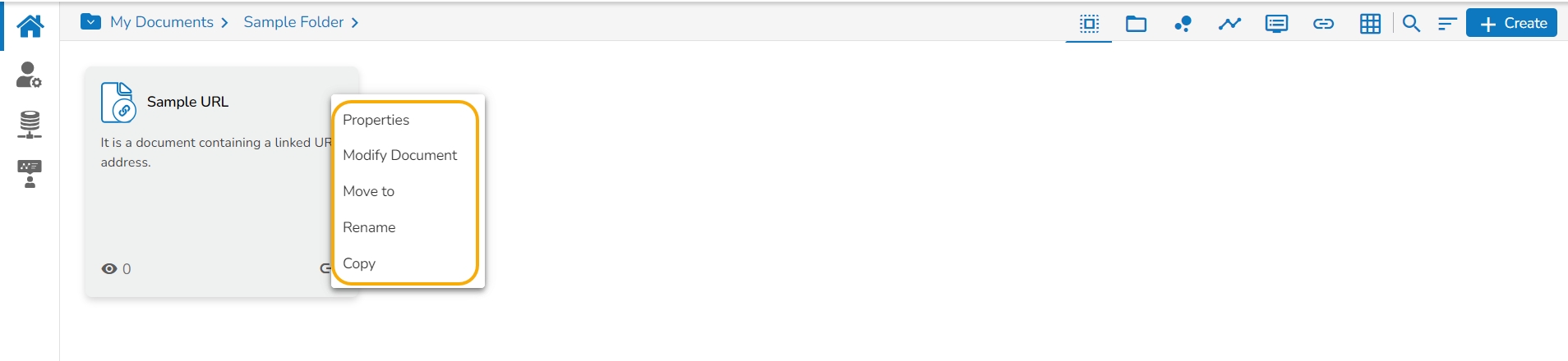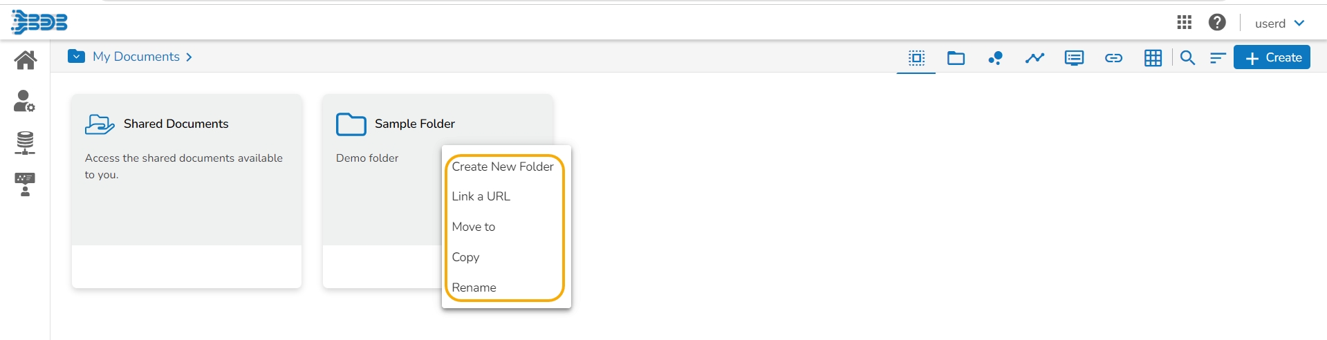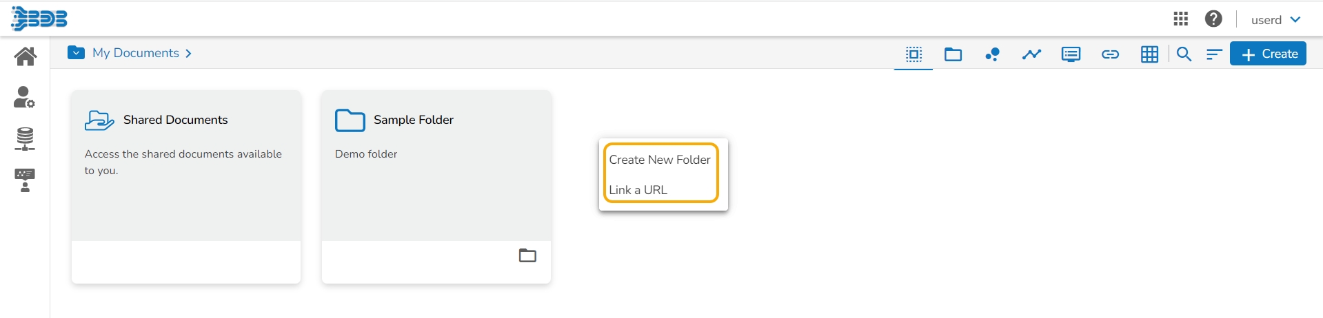 Try to access the attributive options by clicking on the Options icon on the My Documents page. You can see that the user gets only limited (permitted) options. E.g., Only the Create Folder and Link a URL options are visible in the following image.