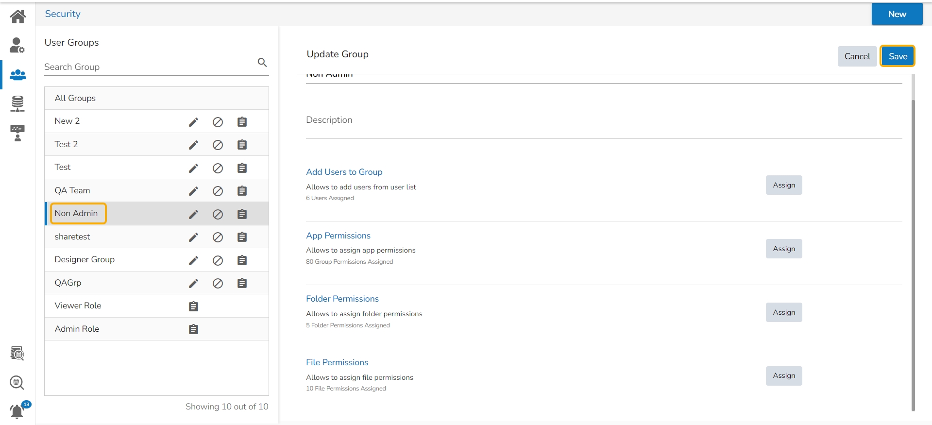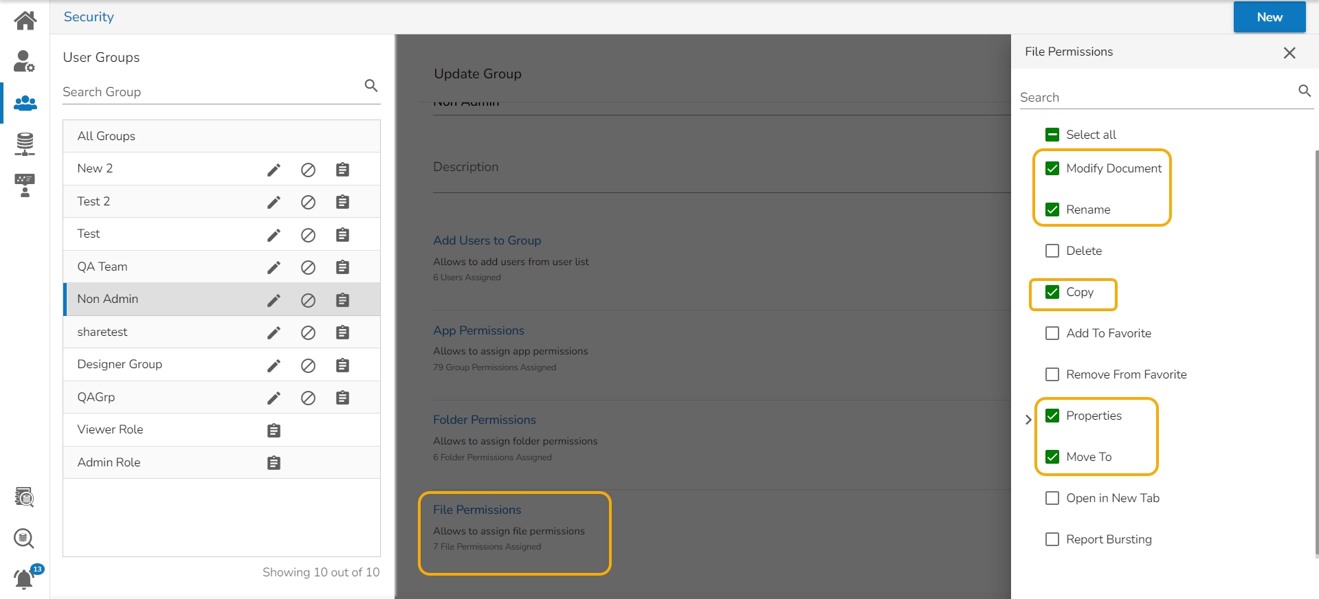 The user can check out various access permissions provided to the user group or customize the given permissions to the selected group.