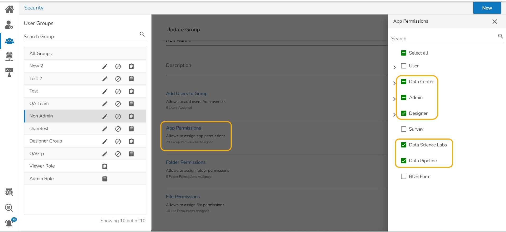 App Permissions: The group has permission to access the Data Center and Designer modules.