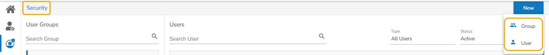 By default, the landing page displays All Groups selected from the User Groups list and All Users selected from the Type drop-down menu containing the Active Status.