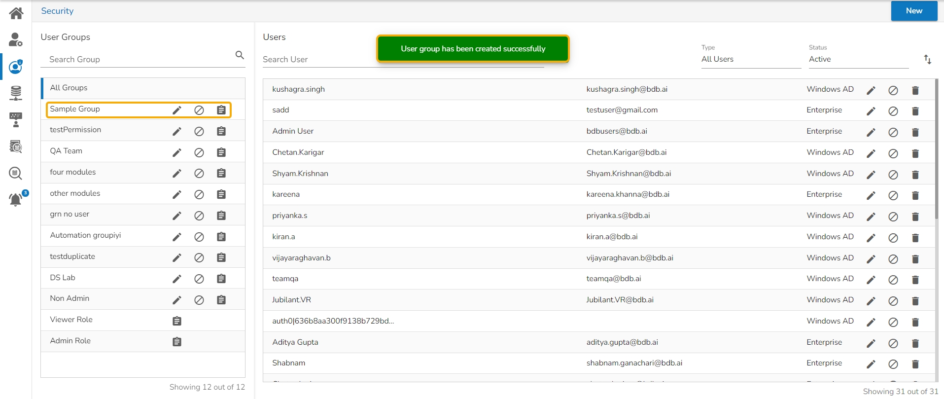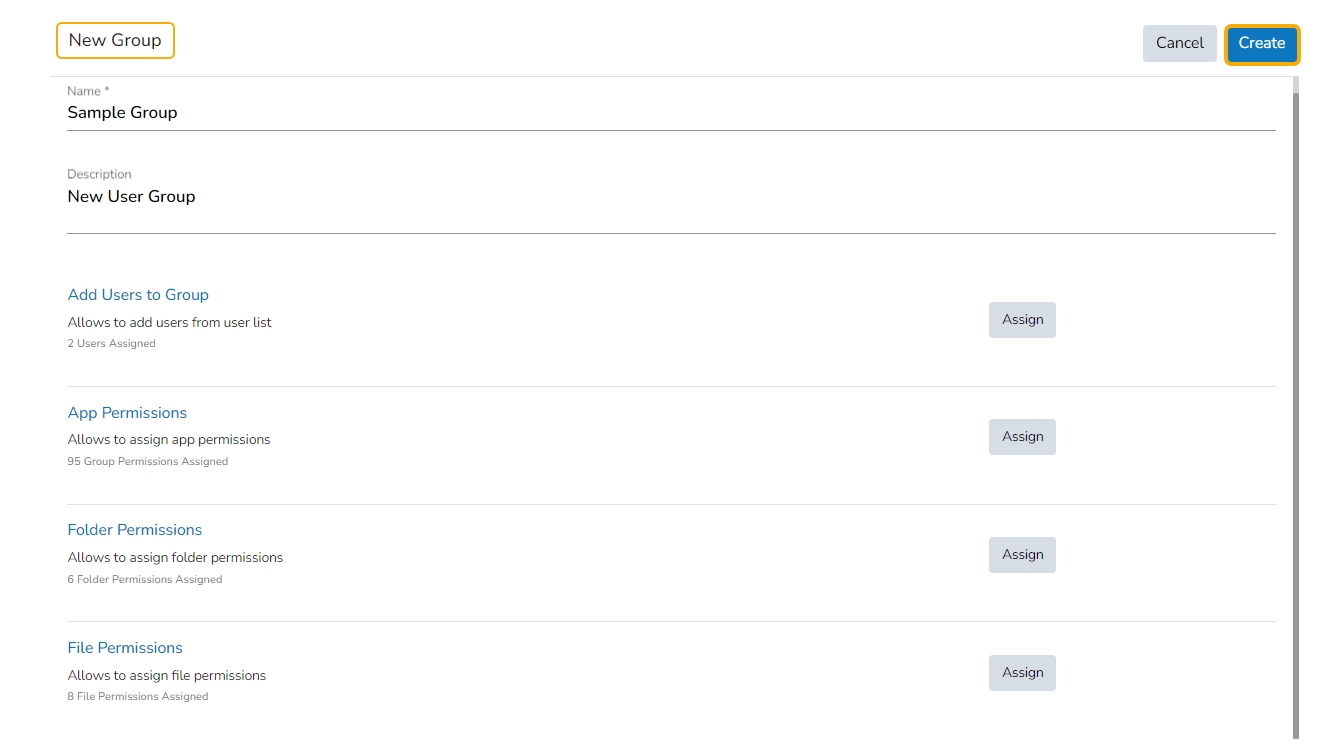 After adding users and allowing the required Permissions to the new group, click the Create option for the new User Group.