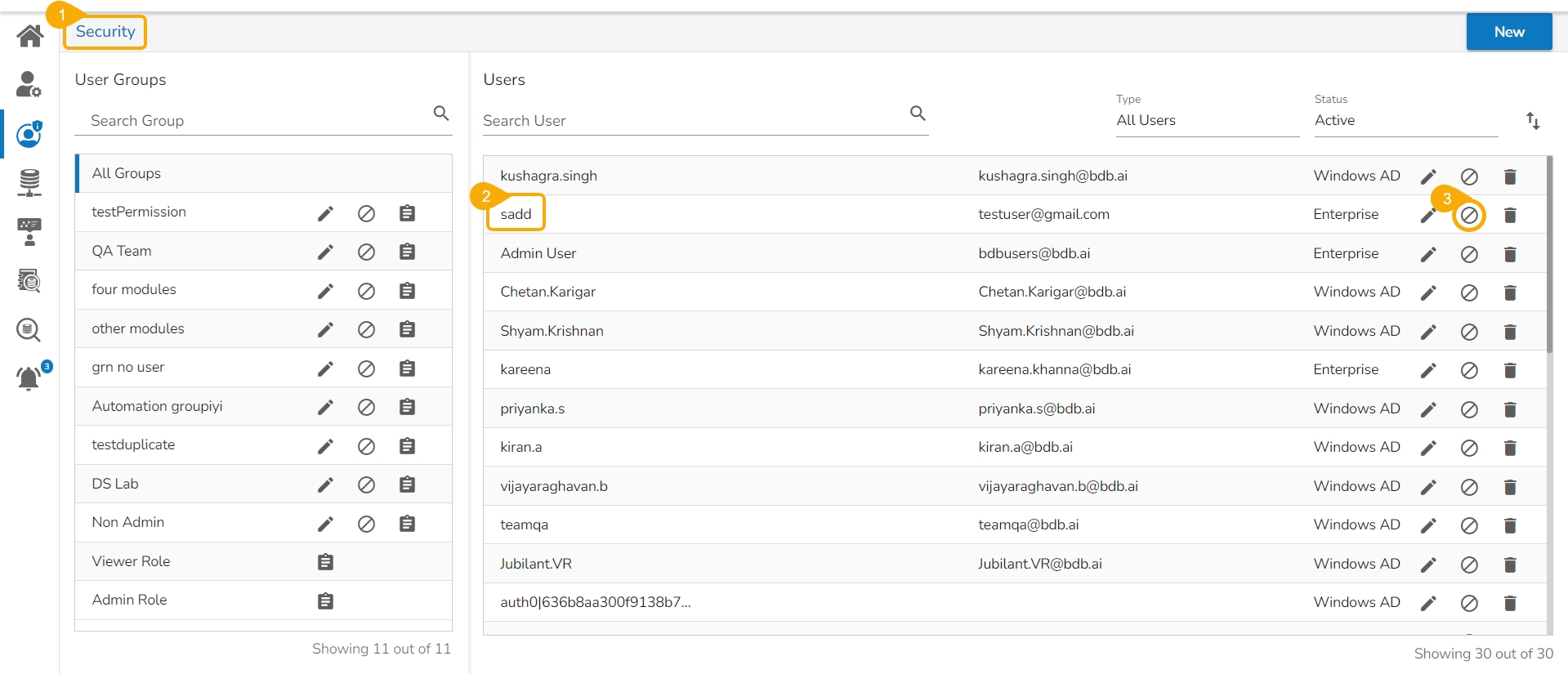 Select a user from the Users list. (By default, the Users list displays All Users type listing Active users)