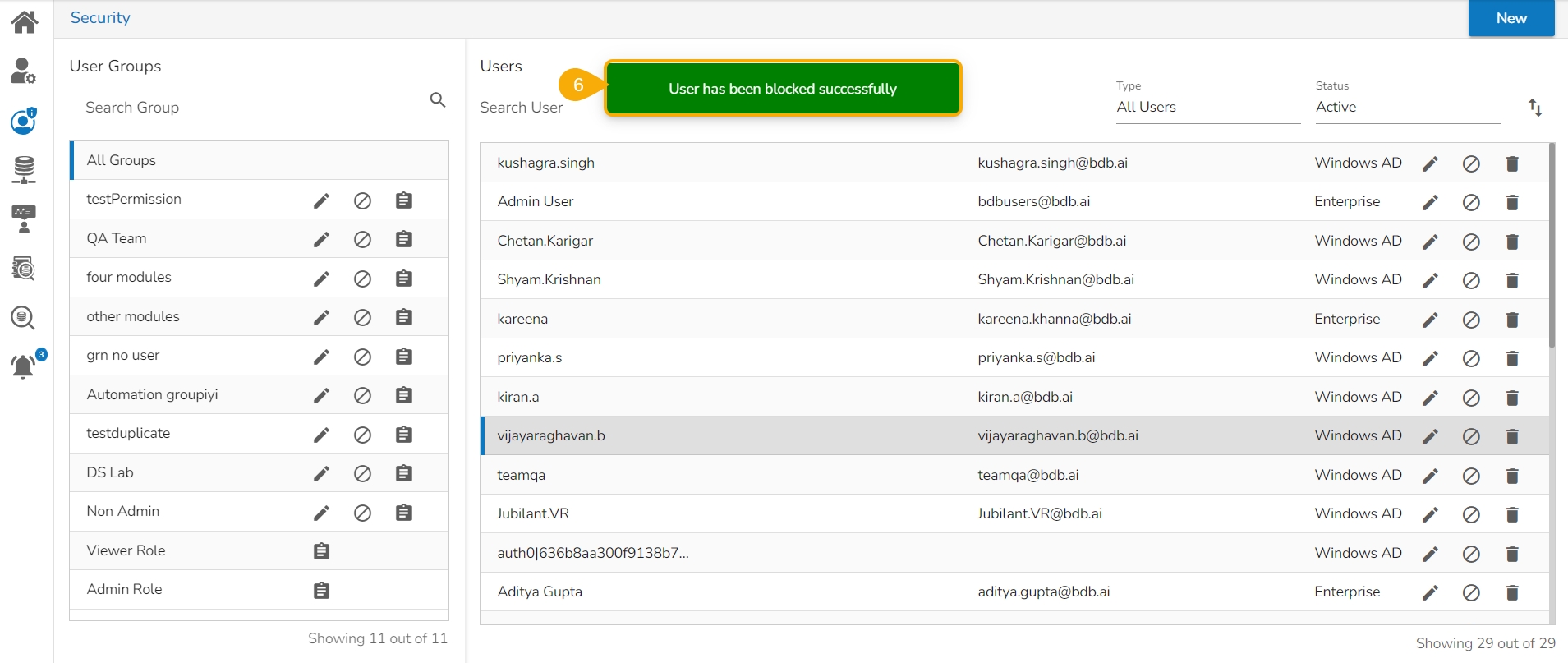 A notification message appears, and the selected user gets removed from the Active Users list.