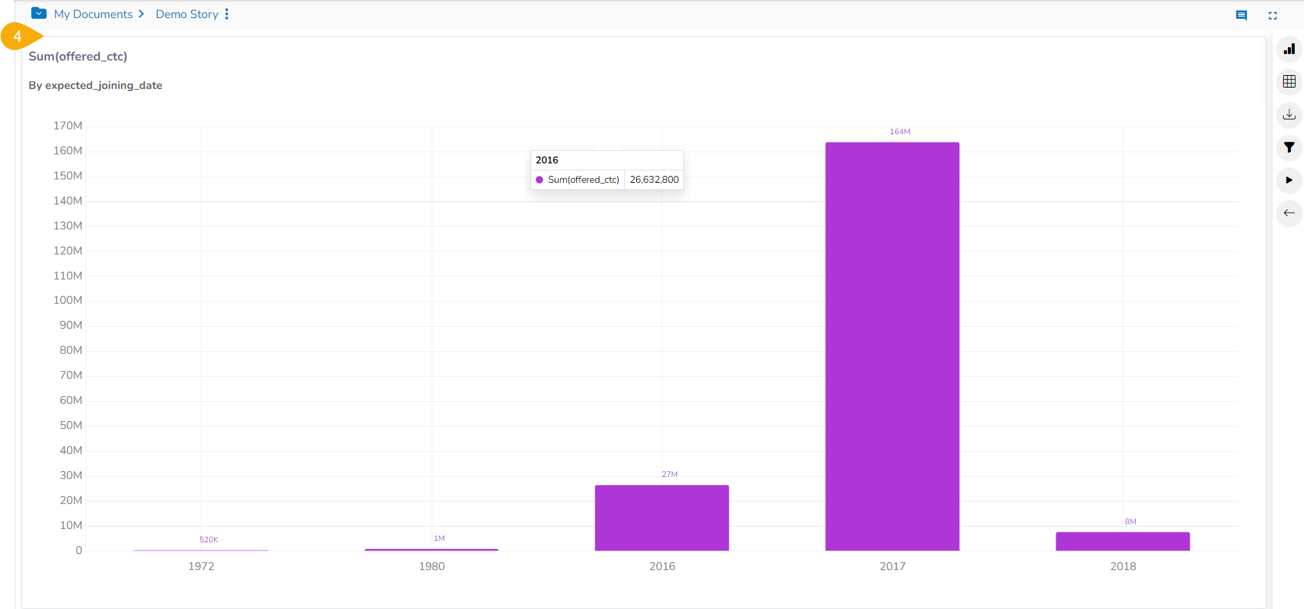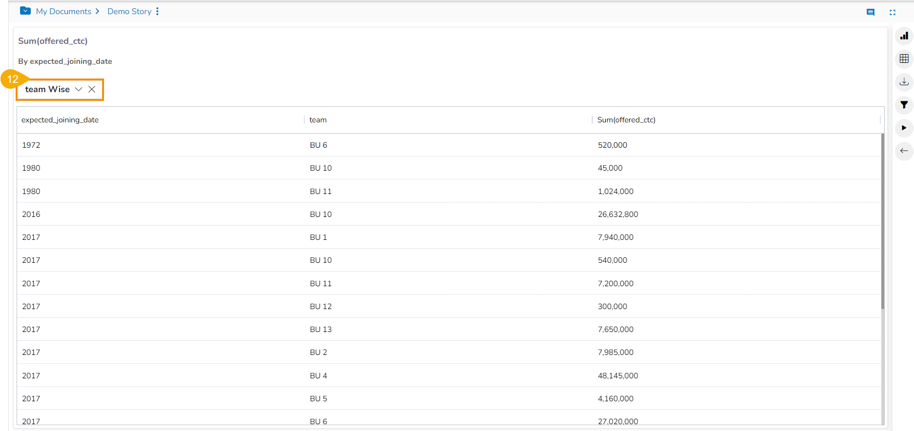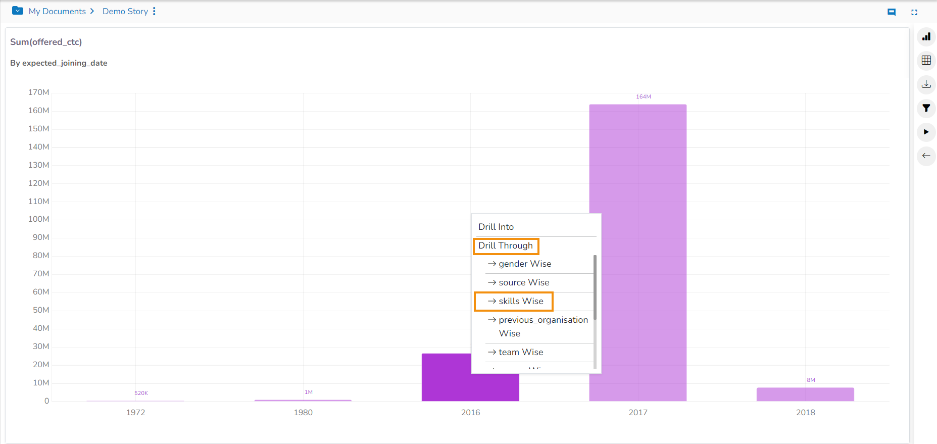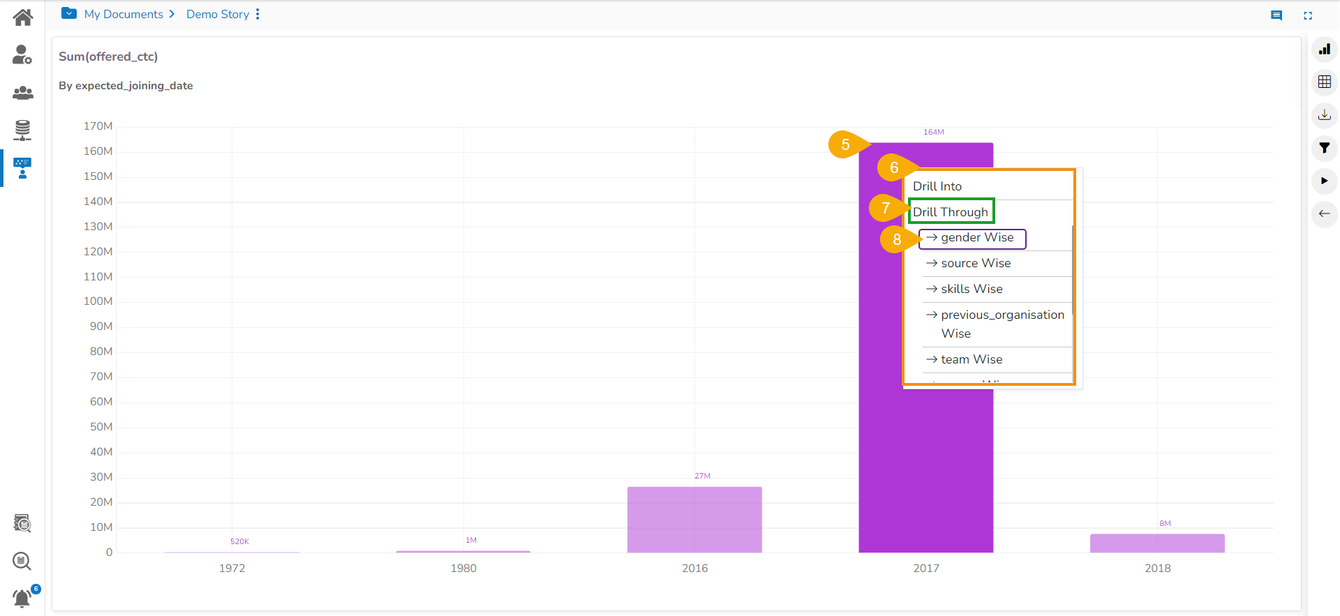 The Drill Through option allows the users to drill down in the data values of a saved view on the storyboard for the selected story.