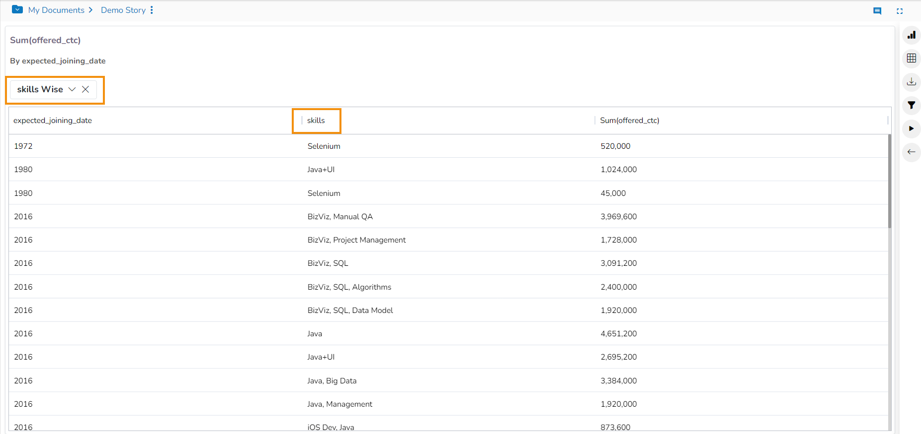 * The customised data as per the another selected drill-through Dimension option gets displayed. E.g., the following image displays the Skill wise data for the selected View.